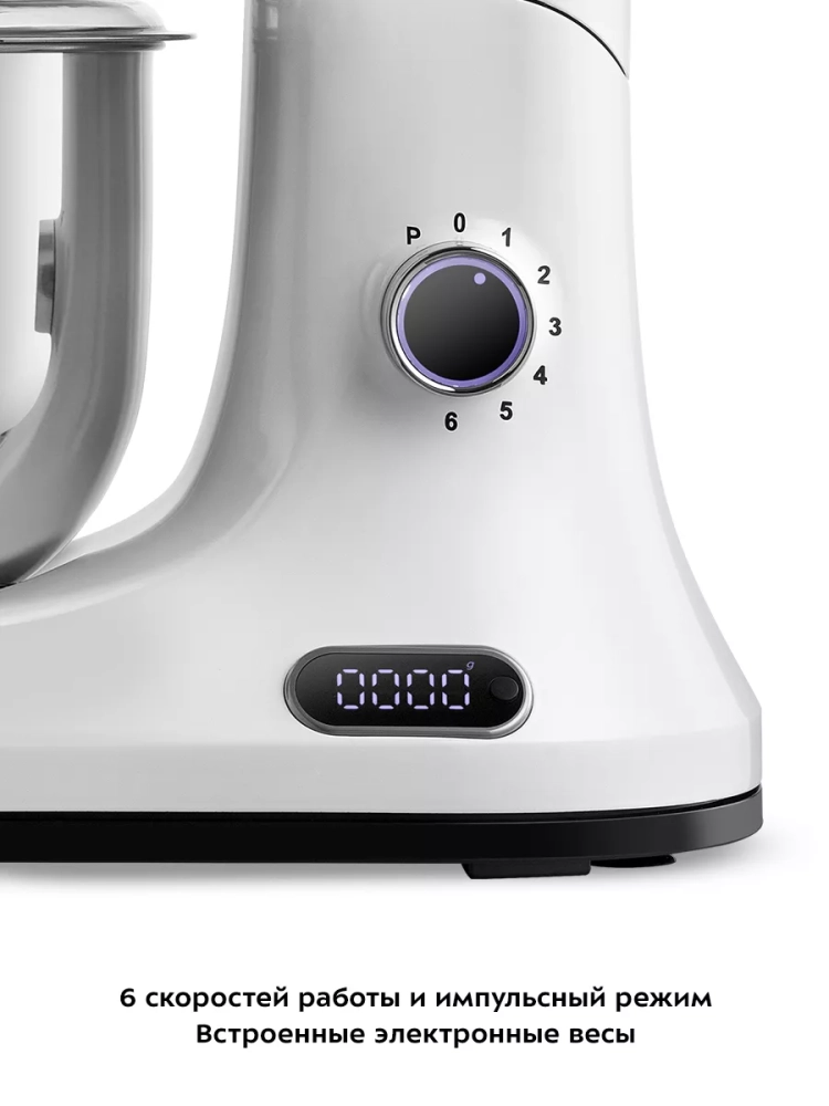 У прибора 6 скоростей и импульсный режим. Также миксер имеет встроенные электронные весы.
