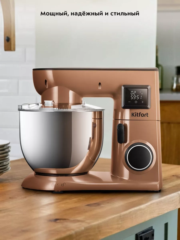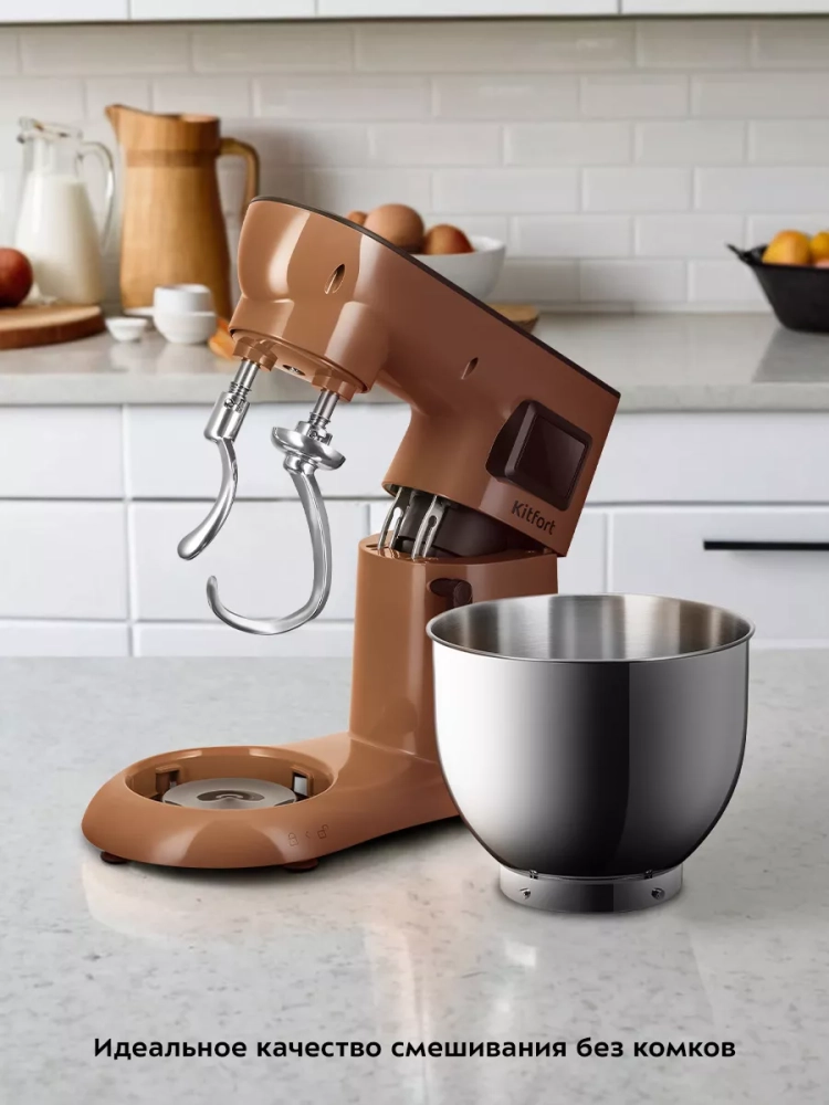 Цельнометаллический планетарный миксер Kitfort КТ-4409 поможет вам смешать ингредиенты, взбить яичный белок или сливки, приготовить картофельное пюре, соус, крем, мусс, замесить жидкое тесто для блинов и крутое — для пельменей и пирогов. В комплекте есть венчик для взбивания, насадка для смешивания и крюки для замешивания.