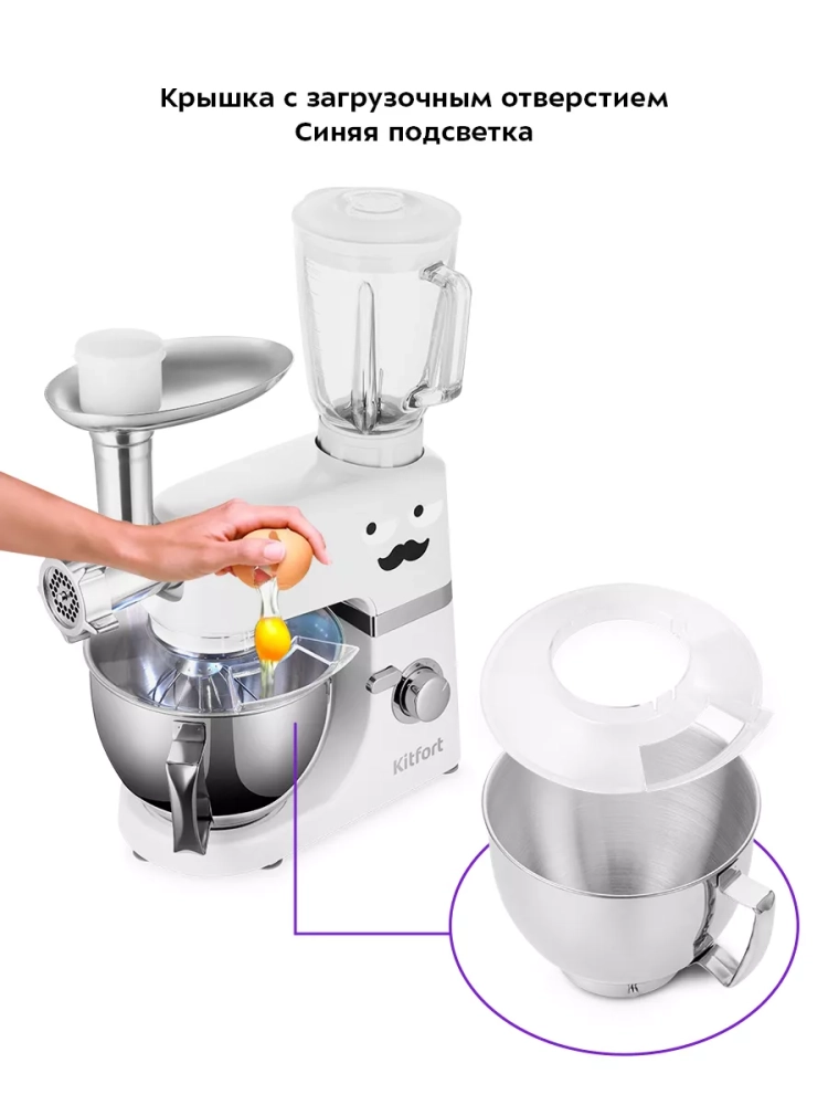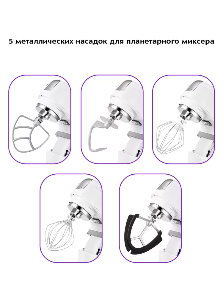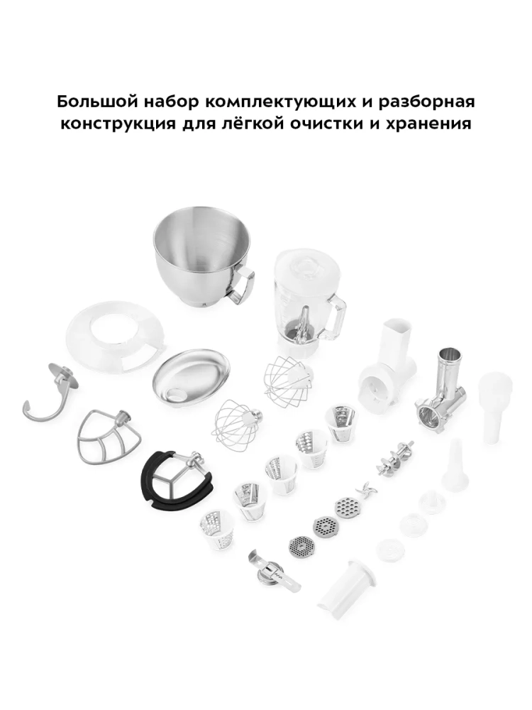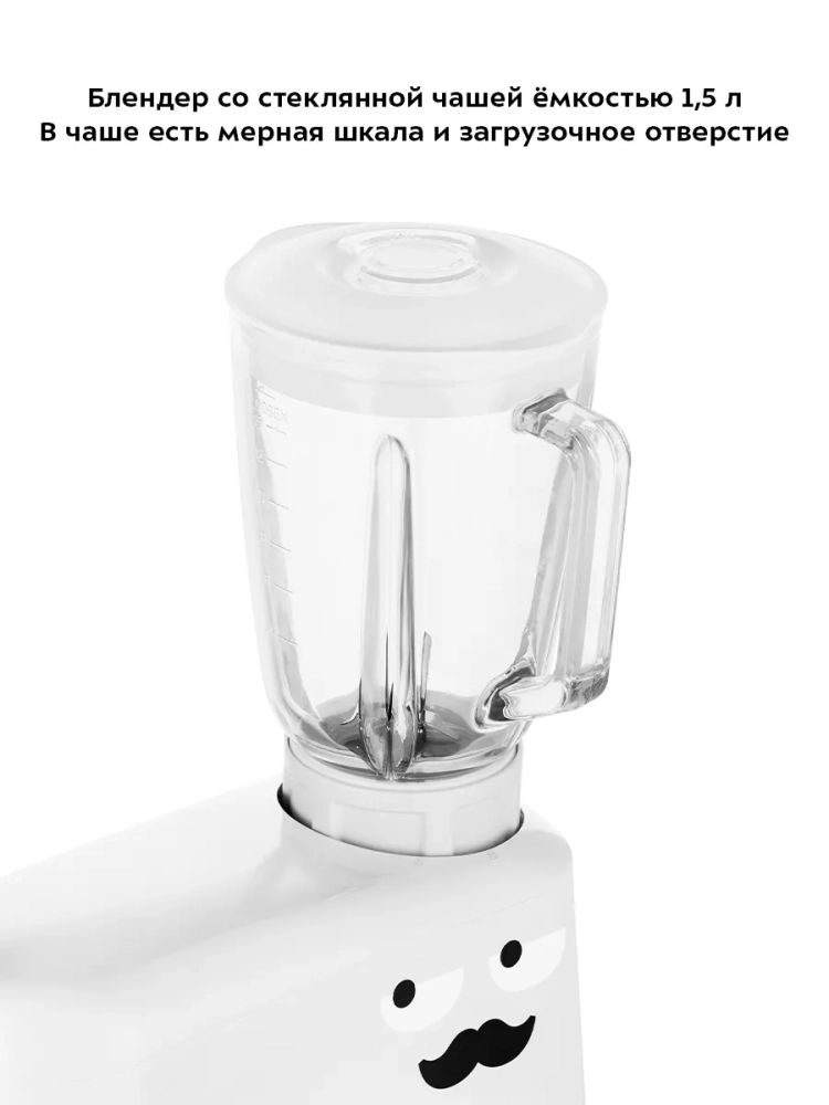 Чаша закрепляется на базе и укомплектована защитной крышкой с отверстием. В комплекте идут венчик для взбивания, насадка для смешивания и приготовления пюре, крюк для замеса крутого теста, а также силиконовая насадка для смешивания.