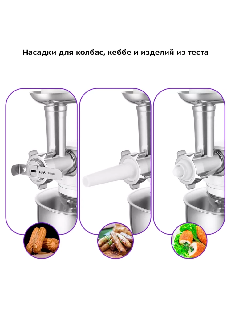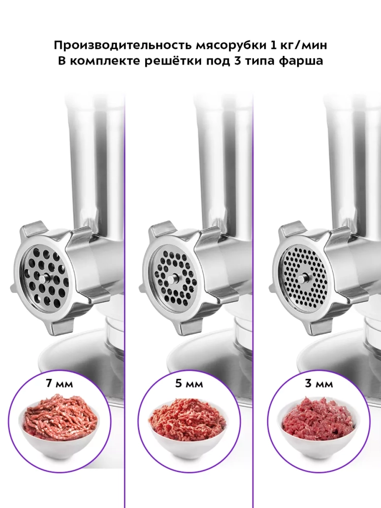 В комплект к мясорубке входят 3 решетки для изготовления фарша, специальные насадки для колбас и кеббе, насадка для выдавливания форменных изделий из теста и насадка для печенья. Толкатель мясорубки сделан в виде контейнера с крышкой, в котором удобно хранить все насадки и решетки.