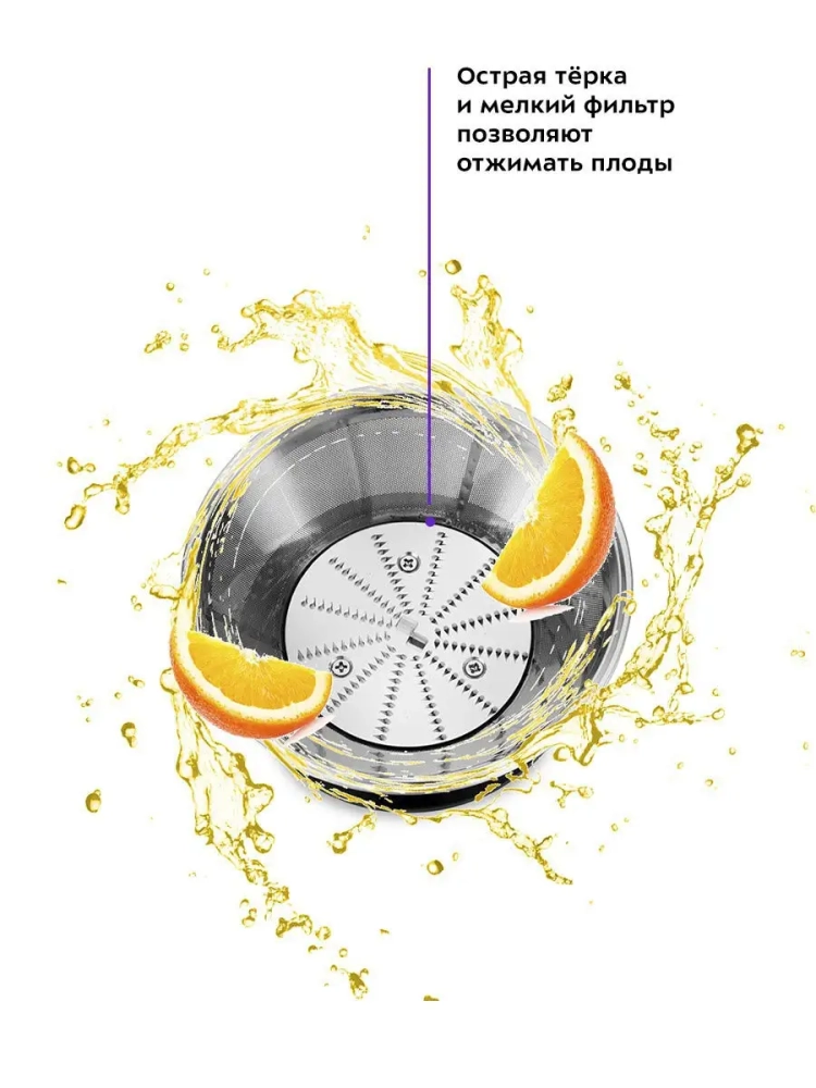 Центробежная соковыжималка позволяет отжимать практически любые фрукты, овощи и зелень. За счет большого диаметра загрузочной горловины есть возможность загружать крупные продукты: целые яблоки, морковь и т.д.