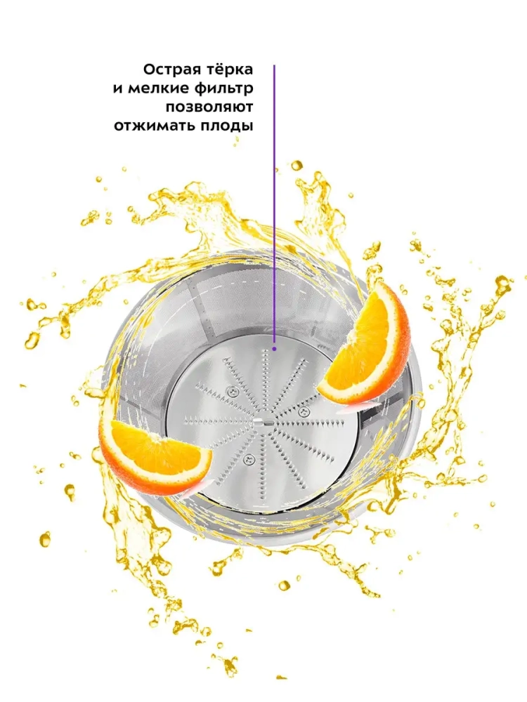Центробежная соковыжималка позволяет отжимать практически любые фрукты, овощи и зелень. За счет большого диаметра загрузочной горловины есть возможность загружать крупные продукты: целые яблоки, морковь и т.д.
