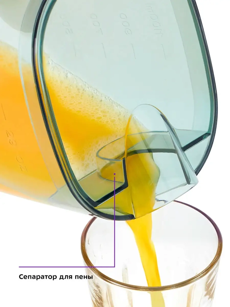 В крышке контейнера для сока предусмотрен несъемный декантер для отделения пены от сока.
