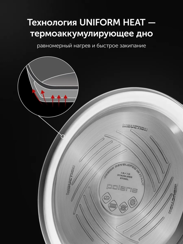 Термоаккумулирующее капсулированное двойное дно обладает технологией UNIFORM HEAT, которая обеспечивает равномерный нагрев, быстрое закипание и долгое сохранение температуры.