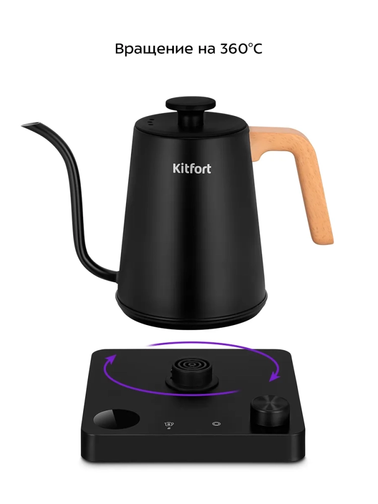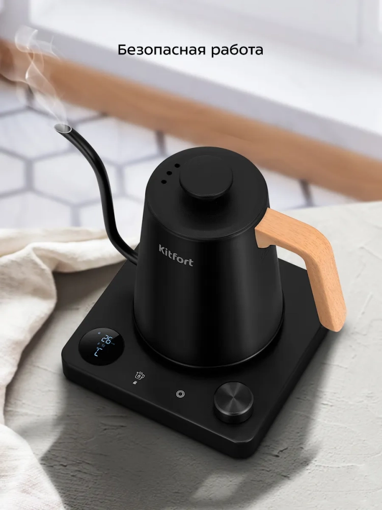 Электрический чайник для варки кофе Kitfort КТ-6726 предназначен для кипячения и нагрева воды, а также приготовления кофе способами кемекс или пуровер. Чайник может нагреть воду до температур от 40 до 100 °С, что очень удобно при приготовлении детского питания и заваривании кофе и различных сортов чая. Чайник также оснащен функцией поддержания температуры. Температура воды контролируется встроенным в дно чайника термодатчиком. Мощность чайника позволяет использовать его в домах со слабой проводкой.
