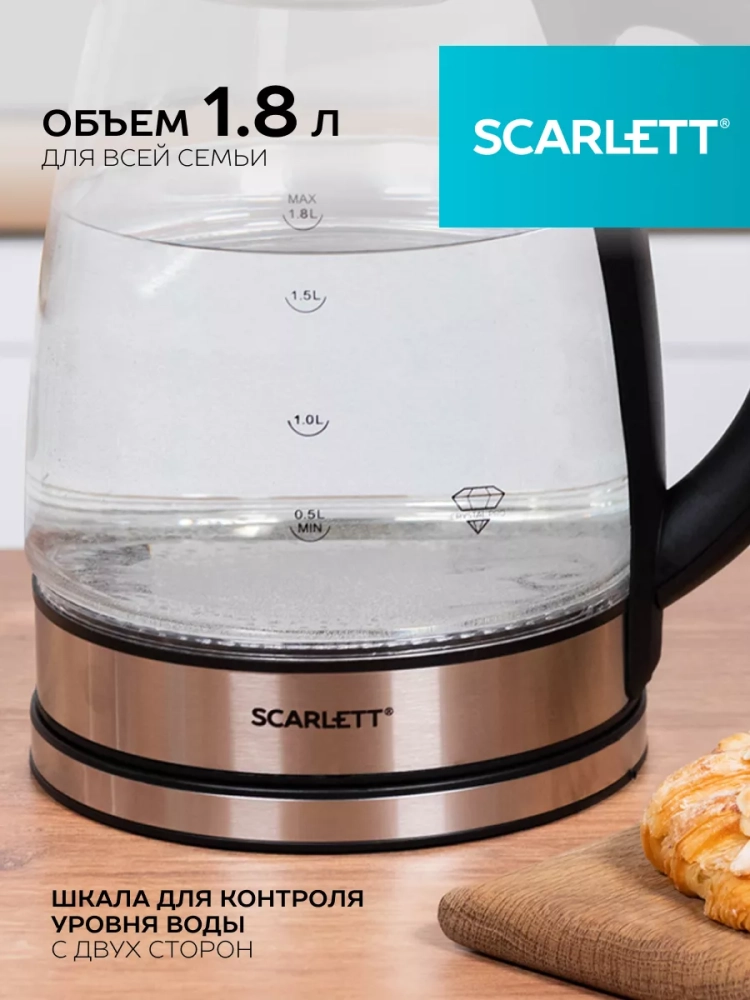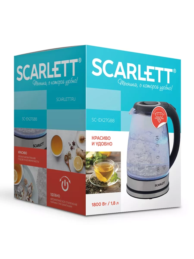 Электрический чайник SC-EK27G88 объемом 1.7 л оснащён традиционной системой открытия крышки. Эргономичная ручка, закрытый нагревательный элемент сделают эксплуатацию прибора еще проще и комфортнее. Внутренняя подсветка позволит наблюдать за завораживающим процессом кипячения. Классический черный цвет корпуса в сочетании с металлической декорацией позволит прибору вписаться в любой интерьер кухни.