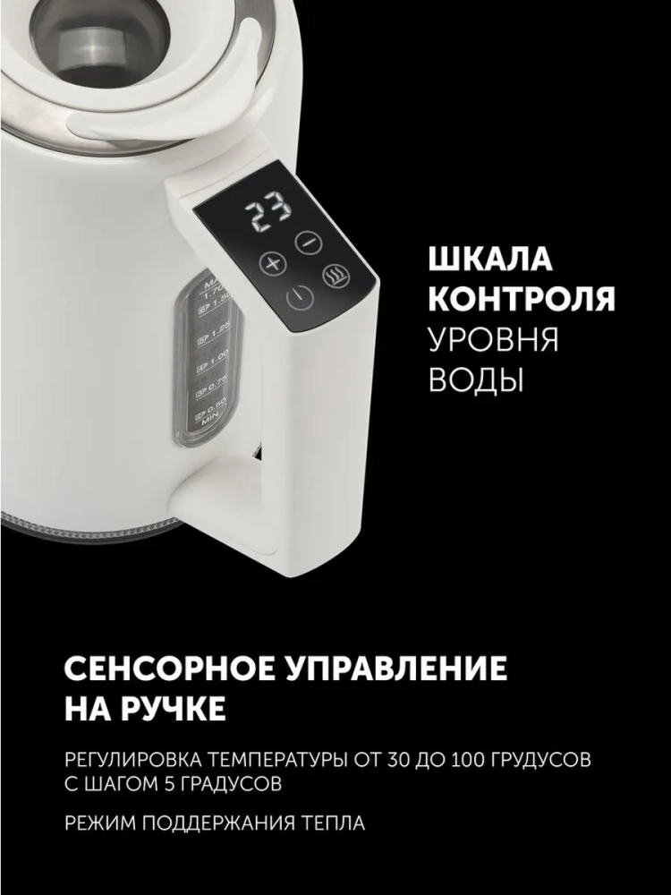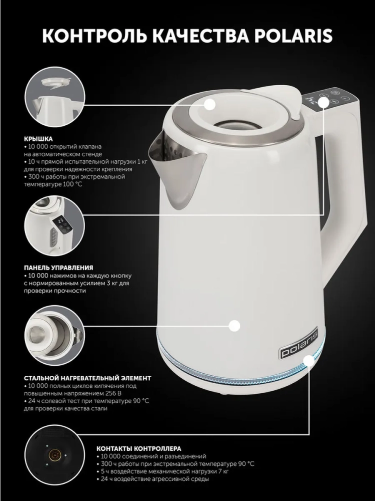 Электрический чайник Polaris PWK 1746 CAD WIFI IQ Home — это умный прибор белого цвета для современной кухни, который сочетает в себе стильный дизайн и передовые технологии. Этот электрочайник с управлением с телефона станет незаменимым помощником для ценителей комфорта и удобства. Металлический корпус чайника со стеклянной мерной шкалой не только придает ему стильный внешний вид, но и обеспечивает долговечность и надежность. С помощью 15 температурных режимов вы сможете подобрать температуру для ароматного чая, кофе и детского питания. Функция подогрева в чайнике электрическом с фильтром от накипи позволит поддерживать нужную температуру воды в течение длительного времени. Инновационная технология Wi-Fi IQ Home позволяет управлять чайником с помощью смартфона, а также голосовыми помощниками Алиса, Маруся и Салют!Умный дом, что открывает новые возможности: включение электрочайника из другой комнаты, включение режима кипячения или поддержания температуры, изменение цвета подсветки и другое. Сенсорное управление и яркая подсветка делают использование чайника еще более удобным и создает уютную атмосферу на вашей кухне. Вращение подставки на 360° обеспечивает удобство использования, а отсек для шнура позволяет компактно хранить чайник. Дисковый нагревательный элемент обеспечивает быстрый нагрев воды, а функция автоотключения гарантирует безопасность. Срок гарантии на электрочайник с терморегулятором от производителя 3 года. Чайник электрический фирмы Polaris PWK 1746 CAD Wi-Fi IQ Home 1.7 л из нержавеющей стали — это идеальное сочетание стиля, функциональности и инноваций для вашего дома.