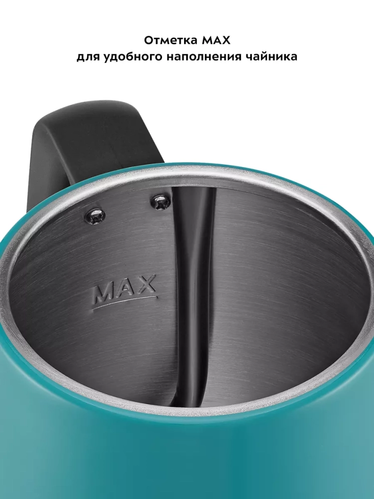 Корпус чайника выполнен из нержавеющей стали. Крышка выполнена из сочетания пластика и нержавеющей стали, а подставка — из пластмассы. Крышка чайника съемная. В ней предусмотрены отверстия для выхода пара. Отметка «MAX» находится внутри чайника. Ручка чайника пластиковая, не нагревается и удобно лежит в руке. Внутренняя поверхность чайника полностью состоит из металла, благодаря чему вода не соприкасается с пластиком.