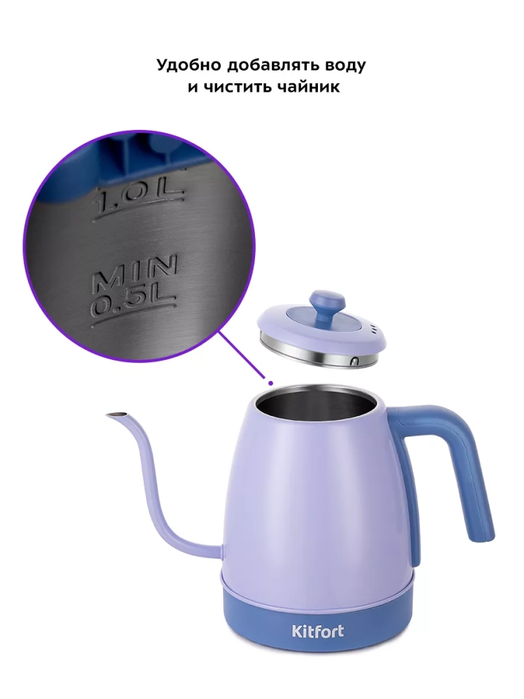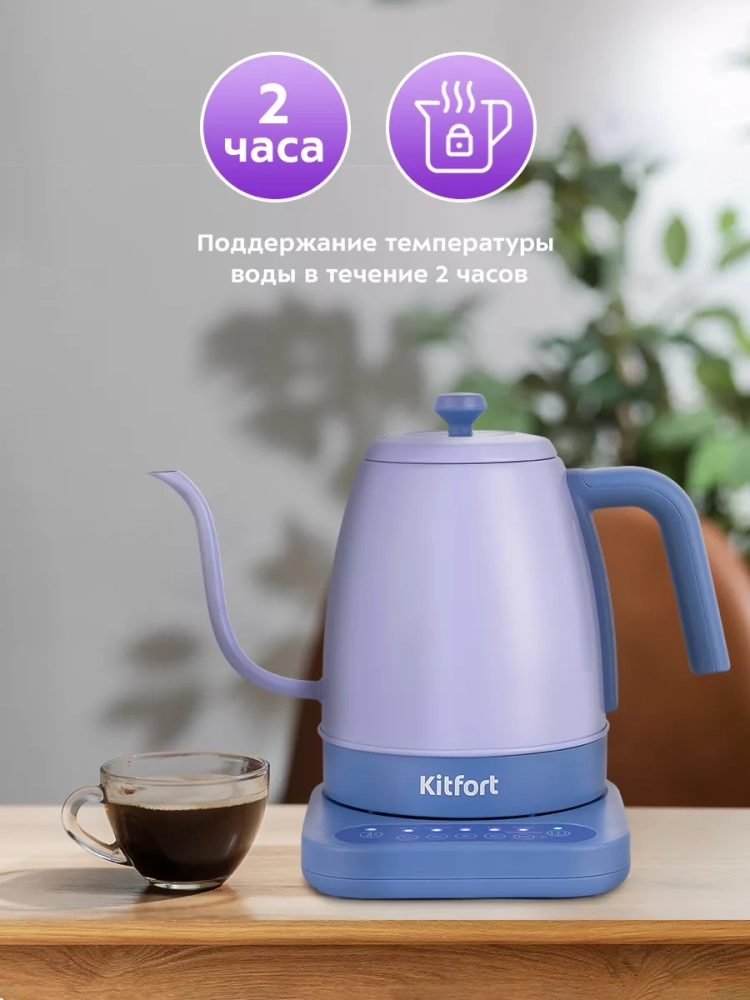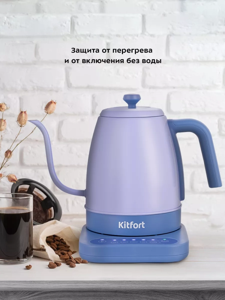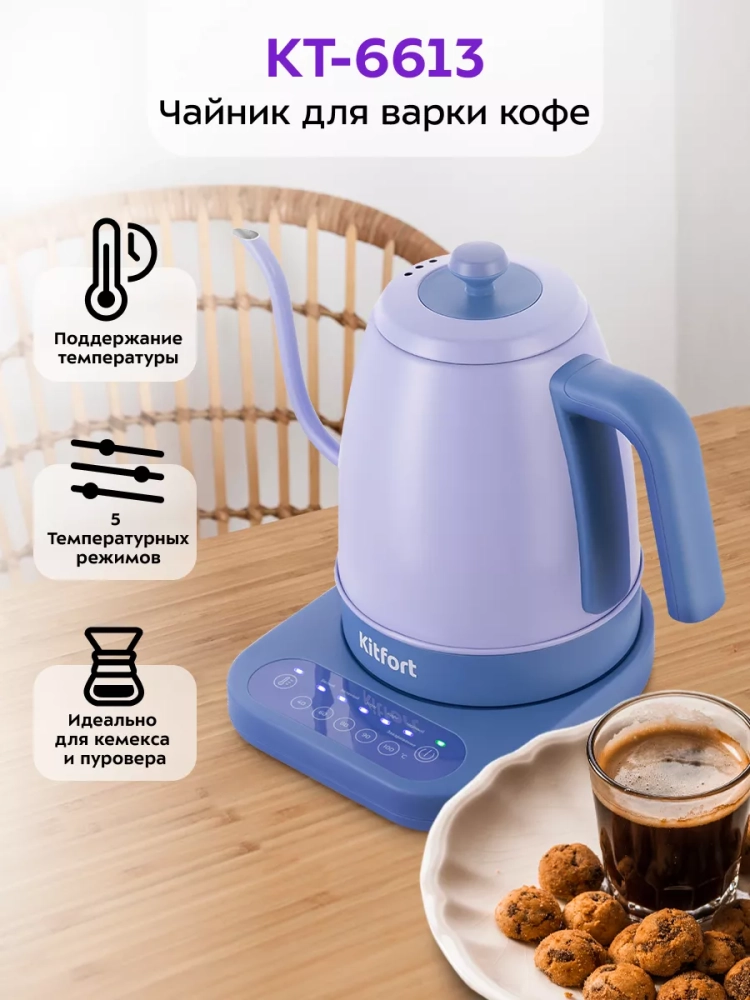 Электрический чайник с терморегулятором Kitfort КТ-6613 предназначен для кипячения и нагрева воды, а также приготовления кофе способами кемекс и пуровер. Прибор может нагреть воду до температуры от 40, 60, 80 или 90 °С и поддерживать ее в течение 2 часов. Температура воды контролируется встроенным в дно чайника термодатчиком.