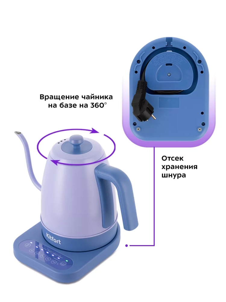База с центральным контактом дает возможность располагать на ней чайник в любом положении, обеспечивая вращение на 360°. Управление осуществляется с помощью панели управления на базе.