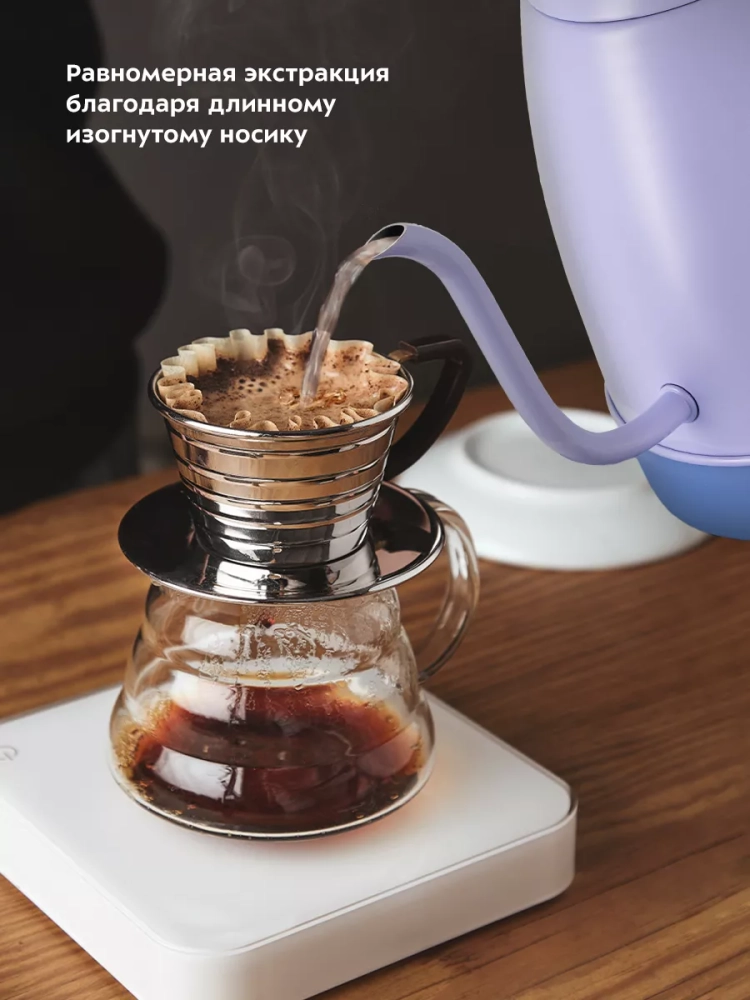 Длинный изогнутый носик чайника формирует тонкий и ровный поток воды, что является обязательным условием для приготовления кофе в кемексе или пуровере. Благодаря тонкому носику вы сможете постепенно и аккуратно добавлять воду в кофе, добиваясь равномерной экстракции. Контролировать пролив воды с помощью обычного чайника неудобно, так как широкий носик не позволяет добиться точно направленной струи воды с определенной скоростью, и в результате вкус и аромат кофе раскрывается не полностью.
