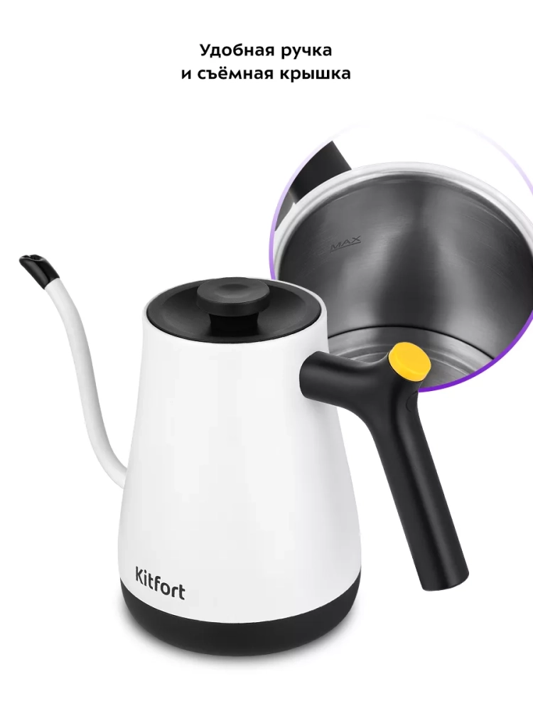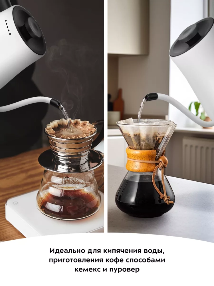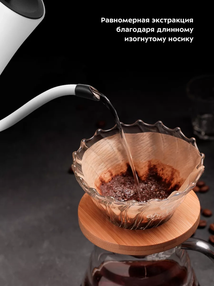 Длинный изогнутый носик чайника формирует тонкий и ровный поток воды, что является обязательным условием для приготовления кофе в кемексе или пуровере. Благодаря тонкому носику вы сможете постепенно и аккуратно добавлять воду в кофе, добиваясь равномерного процесса экстракции. Контролировать пролив воды с помощью обычного чайника неудобно, так как широкий носик не позволяет добиться точно направленного пролива воды с определенной скоростью, и в результате вкус и аромат кофе раскрывается не полностью.