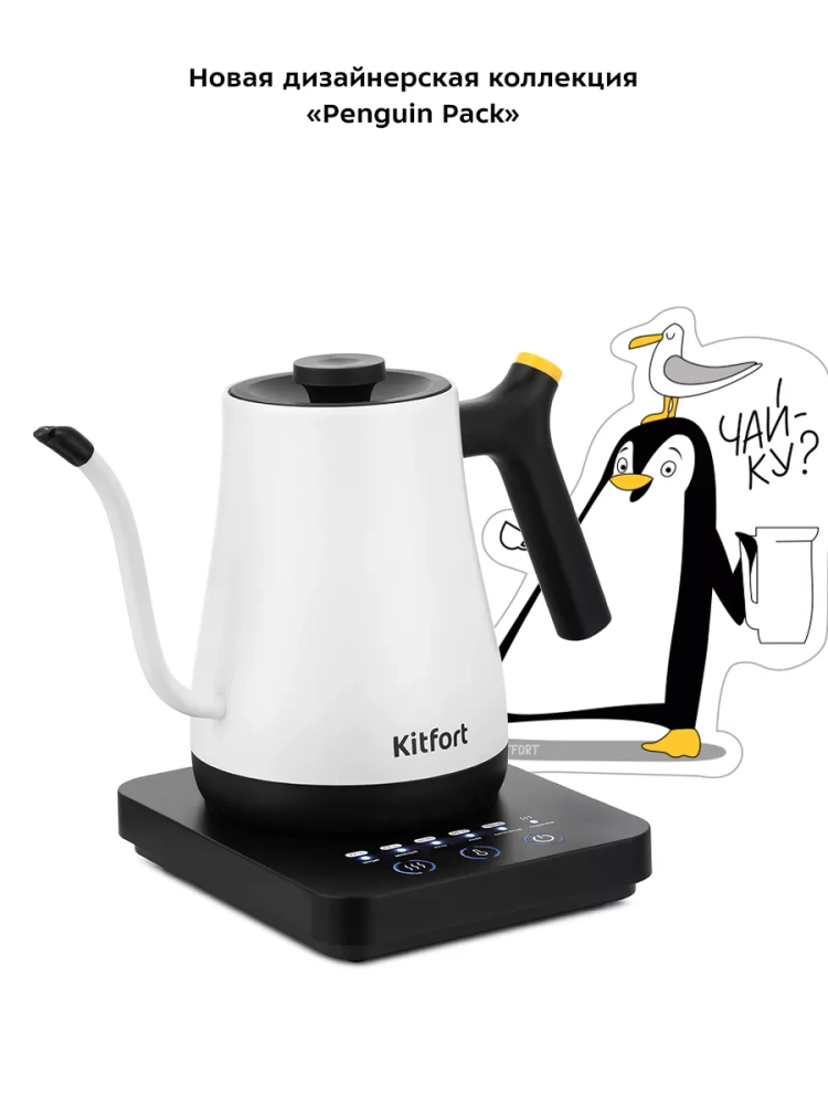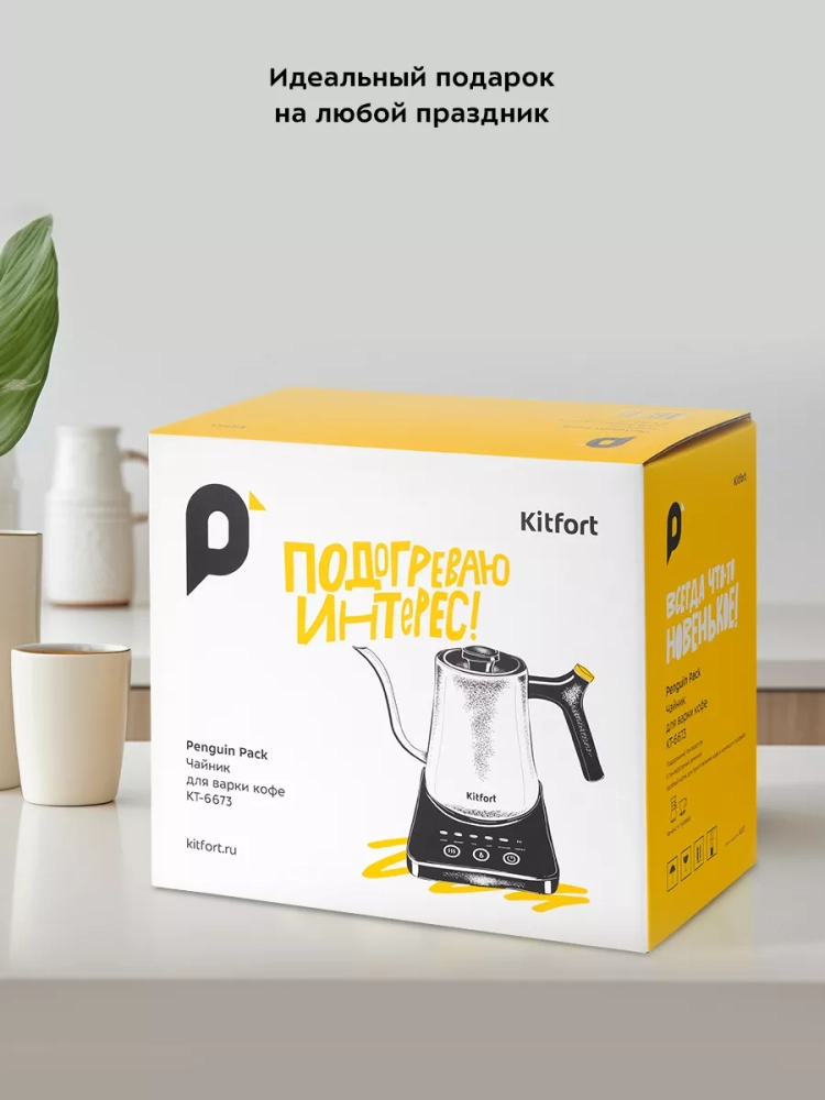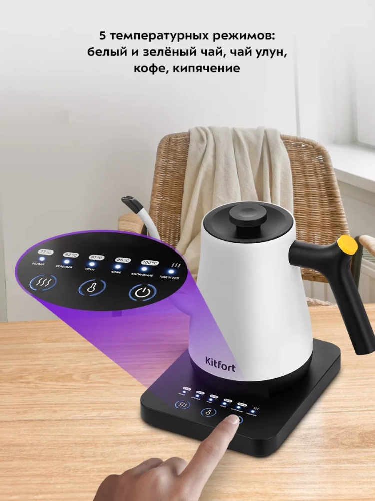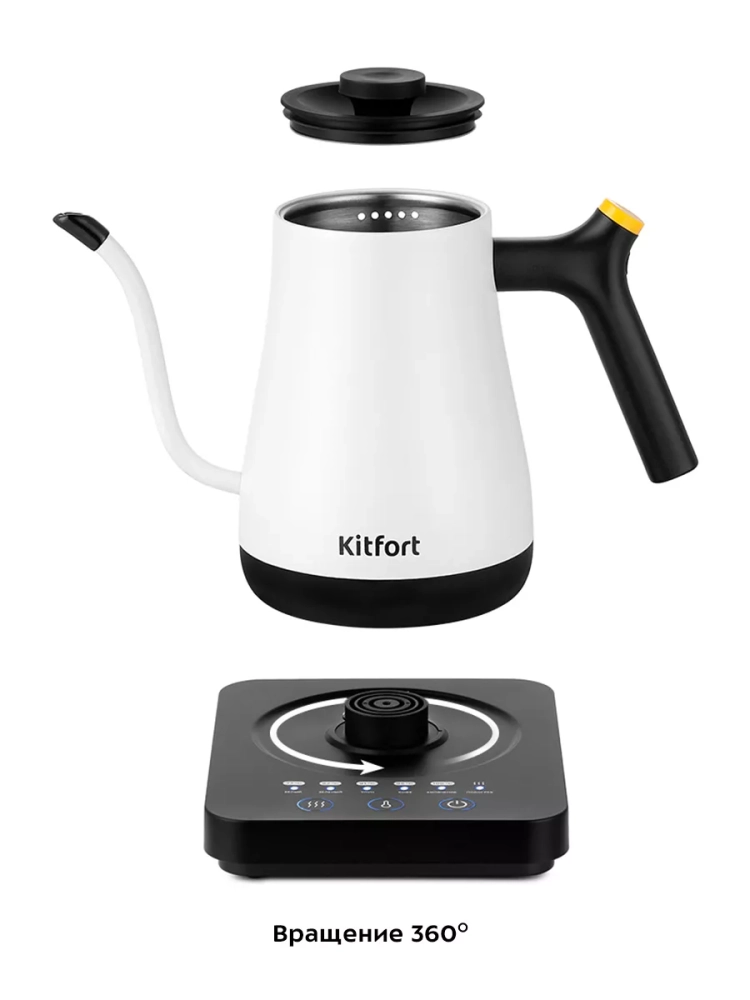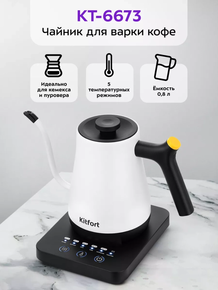 Электрический чайник для варки кофе Kitfort КТ-6673 предназначен для кипячения и нагрева воды, а также приготовления кофе способами кемекс или пуровер. Чайник может нагреть воду до температуры 77 °С (температура заваривания белого чая), 82 °С (температура заваривания зеленого чая), 91 °С (температура заваривания чая улун), 95 °С (температура заваривания кофе), 100 °С (кипячение). Чайник также оснащен функцией поддержания температуры в течение 2 часов после нагрева воды.