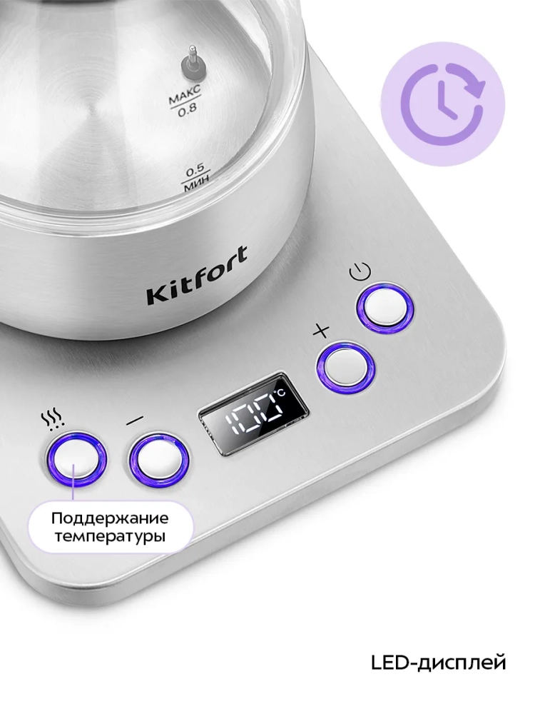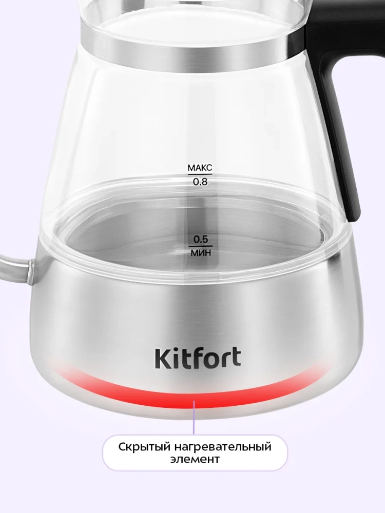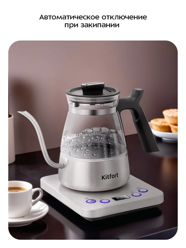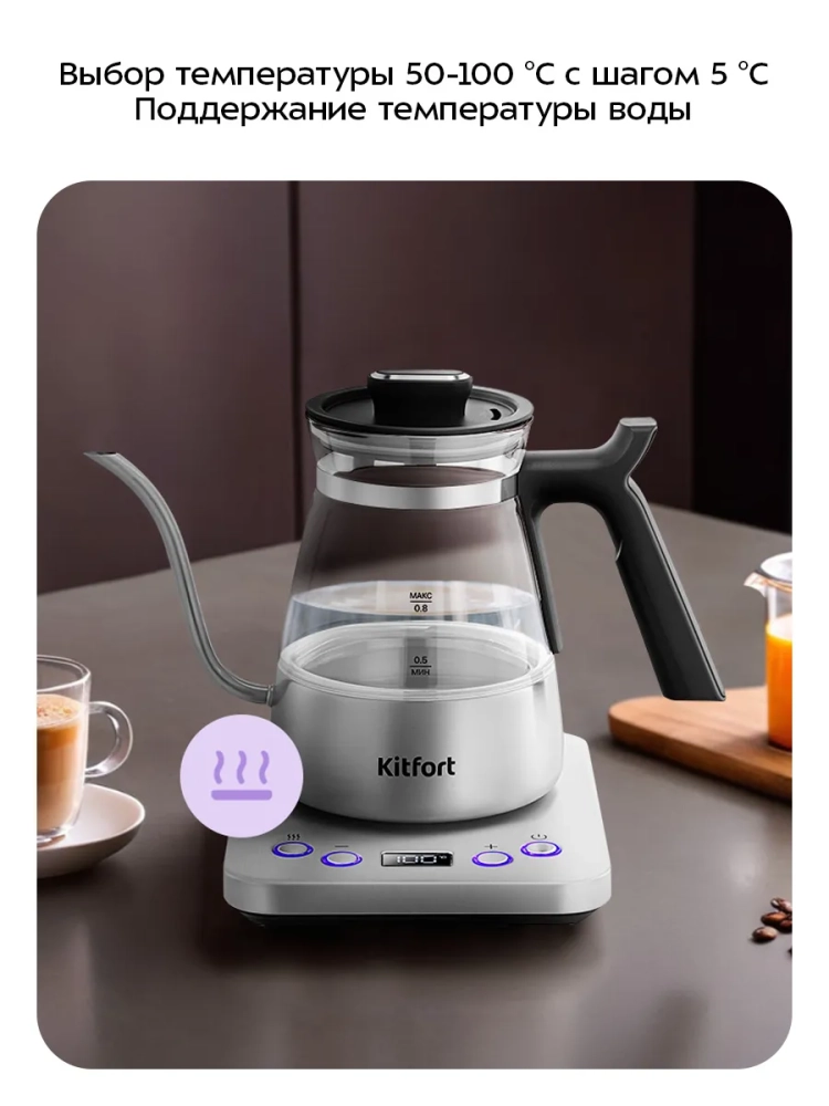 Электрический чайник для варки кофе Kitfort КТ-8707 предназначен для кипячения и нагрева воды, а также приготовления кофе способами кемекс или пуровер. Чайник может нагреть воду до температуры от 50 до 100 °С, что очень удобно при приготовлении детского питания, заваривании кофе и различных сортов чая. Чайник также оснащен функцией поддержания температуры. Температура воды контролируется встроенным в дно чайника термодатчиком.