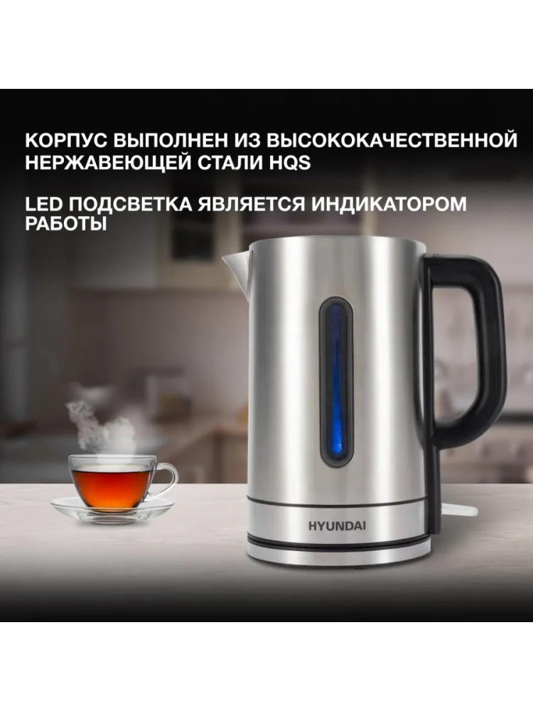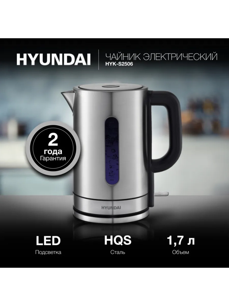 Чайник электрический Hyundai HYK-S2506 серебристый, объём 1.7л, мощность 2200Вт, материал корпуса: металл.