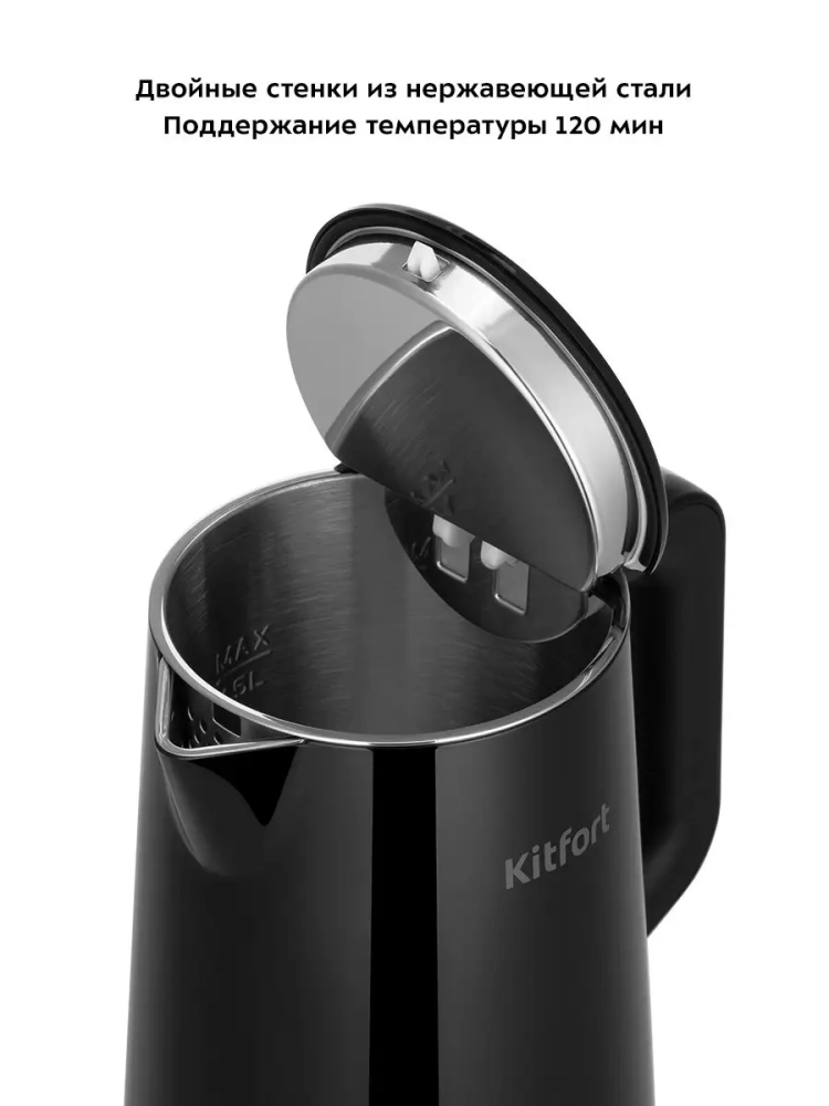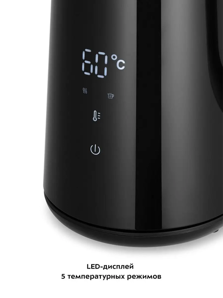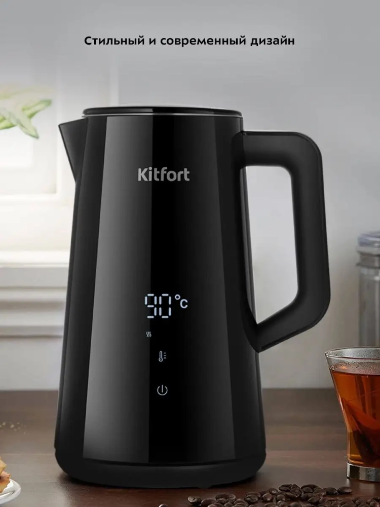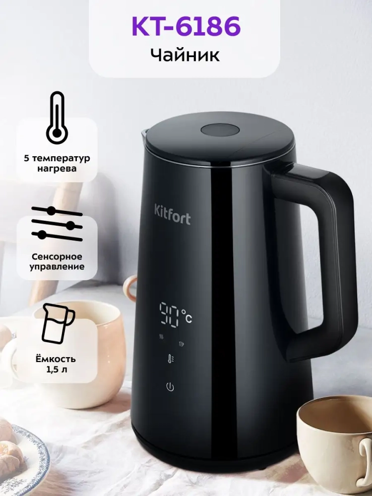 Электрический чайник с электронным терморегулятором Kitfort КТ-6186 может не только вскипятить воду, но и нагреть ее до температур: 40, 60, 85 и 90 °С, что очень удобно при заваривании различных сортов чая. Температура 40 °С удобна для приготовления детского питания. Чайник также оснащен функцией поддержания температуры в течение 2 часов. Температура воды контролируется встроенным в дно чайника термодатчиком.