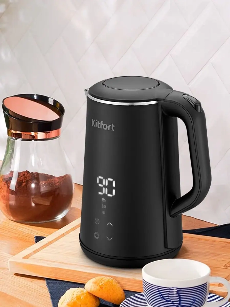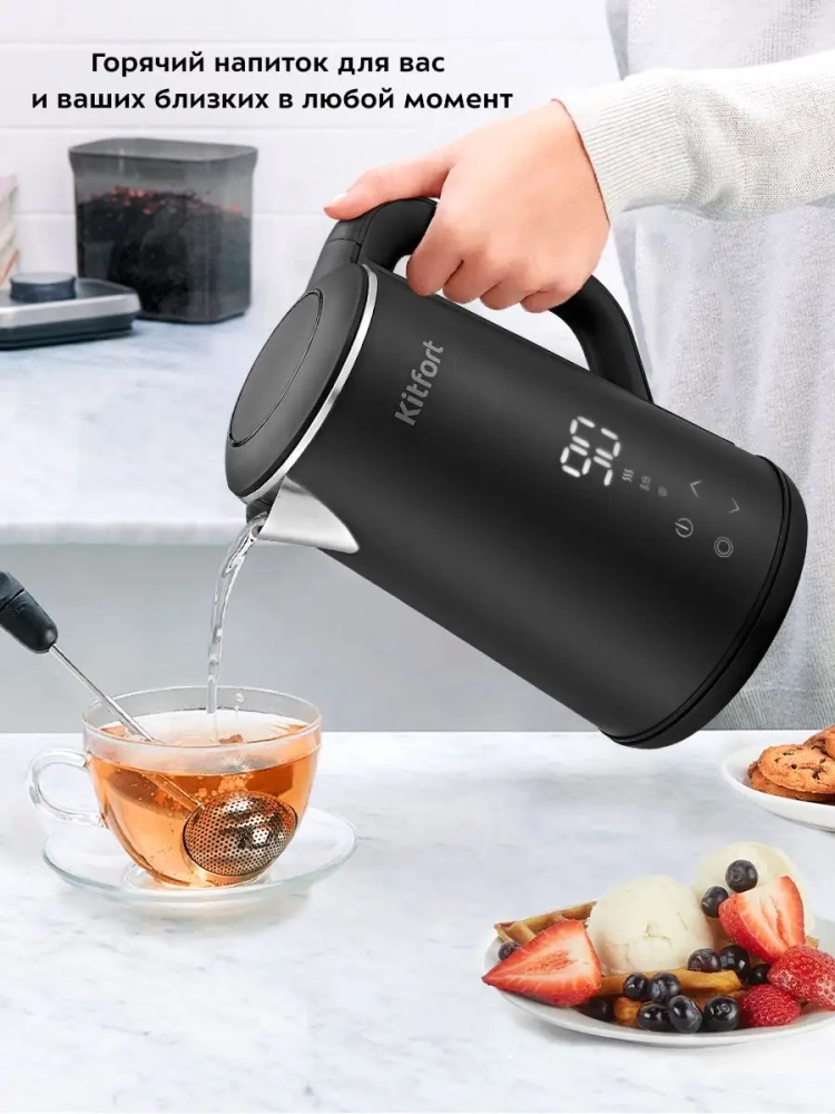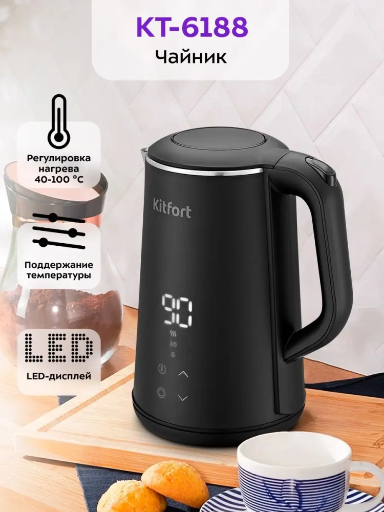 Электрический чайник с электронным терморегулятором Kitfort КТ-6188 может нагреть воду до температуры от 40 до 100 °С с шагом 5 °С, что очень удобно при заваривании различных сортов чая. Температура 40 °С удобна для приготовления детского питания. Чайник также оснащен функцией поддержания температуры в течение 24 часов. Температура воды контролируется встроенным в дно чайника термодатчиком.