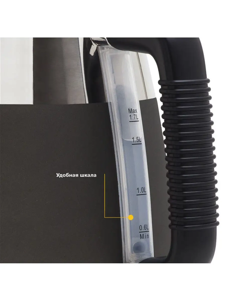 Корпус чайника и подставка выполнен из сочетания металла и пластика, а подставка — из пластика. Мерная шкала находится на корпусе сбоку у ручки.