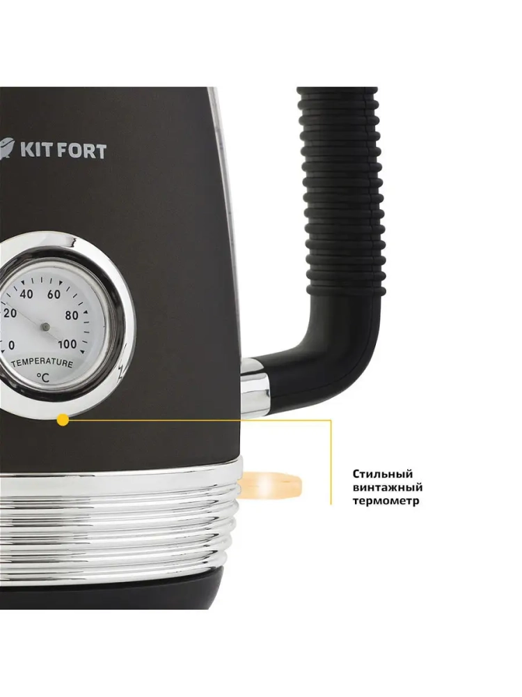 На корпусе чайника установлен термометр, который показывает температуру воды в чайнике. Это удобно, если вы готовите напитки, для которых требуются определенная температура воды, например, зеленый чай, белый чай, кофе и т. д. Для корректной работы термометра наполняйте чайник водой выше минимального уровня.