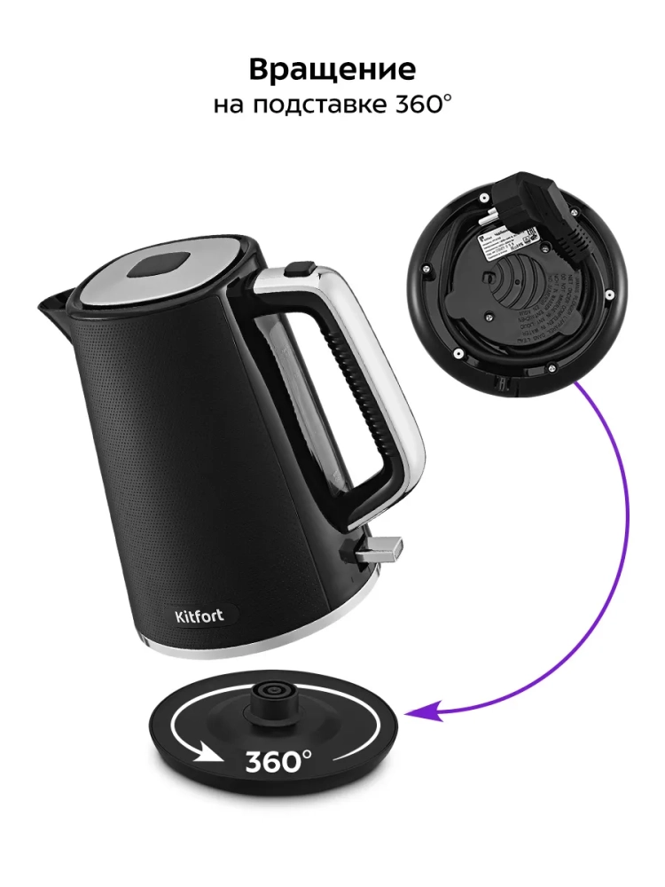 Подставка с центральным контактом дает возможность располагать на ней чайник в любом положении, обеспечивая вращение на 360°. Снизу имеется отсек для хранения шнура, в который можно смотать излишки шнура электропитания, чтобы он не мешал на столе.