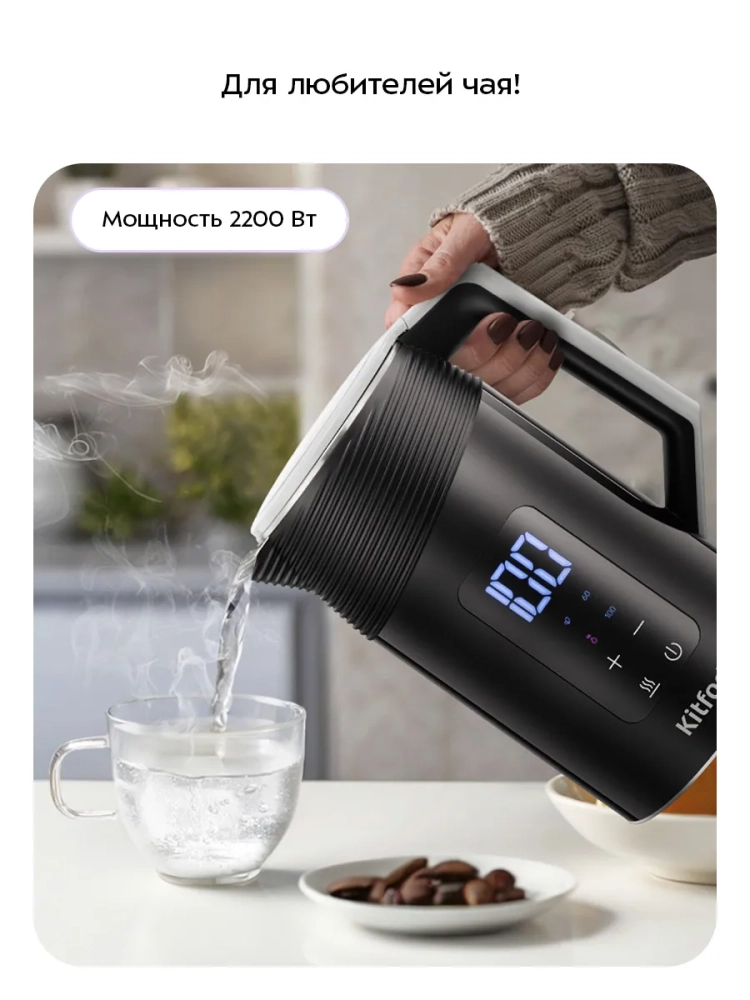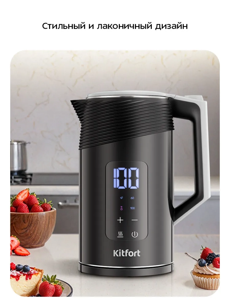 Электрический чайник с электронным терморегулятором Kitfort КТ-8701 может не только вскипятить воду, но и нагреть ее до температуры 40, 60 и 90 °С, что очень удобно при заваривании различных сортов чая, а также при приготовлении детского питания. Чайник также оснащен функцией поддержания температуры в течение 2 и 4 часов (в зависимости от выбранной температуры поддержания). Температура воды контролируется встроенным в дно чайника термодатчиком.