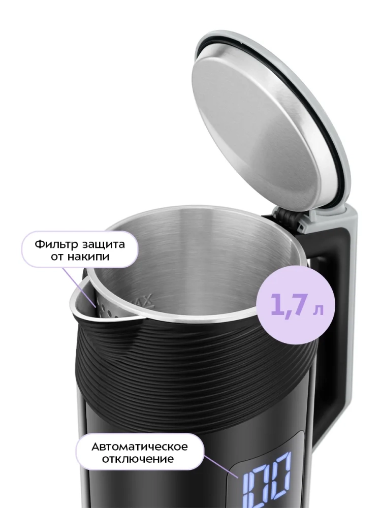 При закипании чайник автоматически отключится. Прибор имеет защиту от перегрева и от включения без воды.
