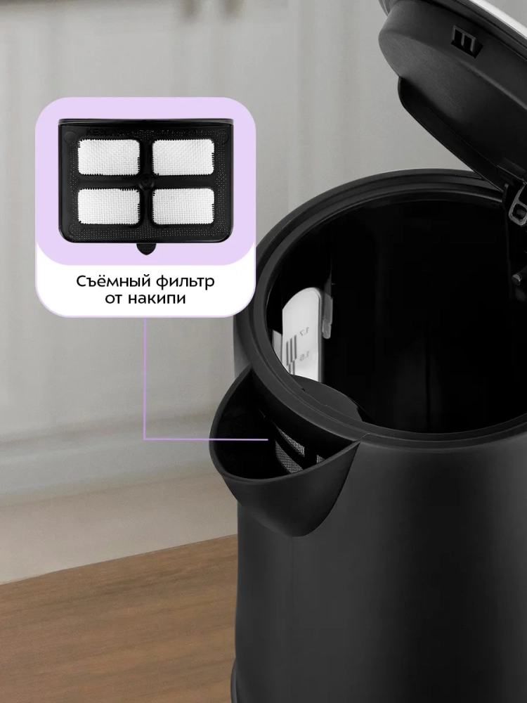 Съемный фильтр внутри носика чайника предотвращает попадание накипи в чашку.