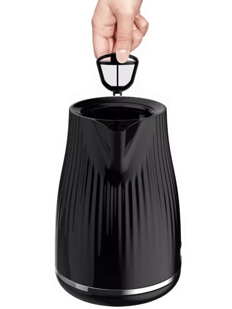 Съемная крышка черного чайника добавляет прибору эстетику стиля ретро и сохраняет удобство использования. Скрытый нагревательный элемент обеспечивает более быстрый нагрев и простоту очистки, а мерная шкала поможет контролировать уровень воды. Съемный фильтр от накипи улучшает вкус воды и легко очищается при необходимости, а особая форма носика позволяет не проливать кипяток мимо чашки.