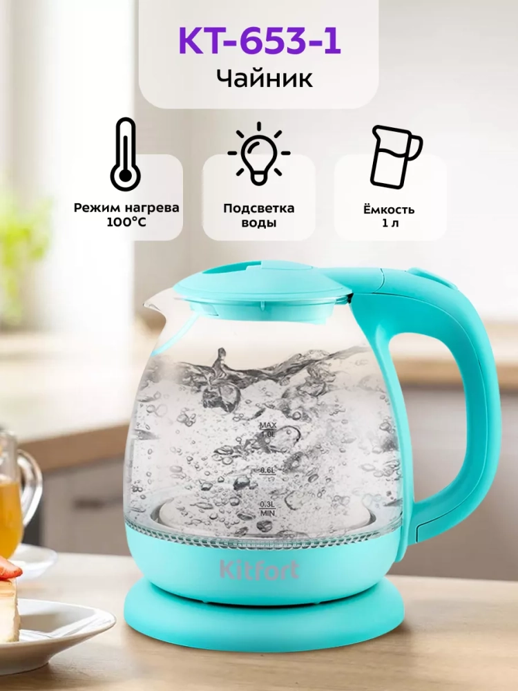 Электрический чайник Kitfort КТ-653 предназначен для кипячения воды дома, в офисе, на даче. Мощность чайника позволяет использовать его в домах со слабой проводкой.