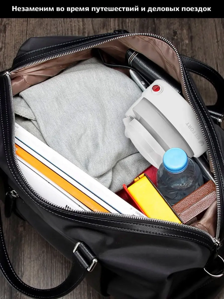 Складной дорожный чайник Kitfort КТ-667 станет незаменимым помощником в путешествиях, деловых поездках и в любых других сложных бытовых условиях. Его корпус эластичный и складывается, так что его можно компактно уложить в багажный чемодан или сумку и везде возить с собой. Корпус чайника выполнен из силикона, крышка и нижняя часть корпуса выполнены из пластика. Мерная шкала находится на боковой поверхности чайника. Ручка чайника пластиковая, не нагревается и удобно лежит в руке, для удобства хранения и перевозки ручку можно сложить. Нагревательный элемент (ТЭН) у этой модели чайника скрытый и находится в донной части. Сверху он закрыт специальной металлической пластиной из нержавеющей стали, благодаря которой исключается прямой контакт ТЭНа с водой. Такая конструкция препятствует образованию накипи, облегчает уход и значительно снижает шум при нагревании воды. Чайник автоматически отключается при закипании, имеет защиту от перегрева и от включения без воды. Контроль температуры и отключение чайника при закипании происходит благодаря термостату который размыкает цепь нагревателя при температуре кипения воды на уровне мирового океана – 100 *С. Термостат отслеживает точную температуру воды в чайнике и размыкает цепь питания ТЭНа при превышении данной температуры. В случае пониженного атмосферного давления, например в горах, чайник не будет отключаться при закипании, поскольку температура отключения (размыкания термостата) не будет достигаться. Также при повышенном давлении, например глубоко под землей, чайник может отключаться раньше чем вода закипит. Это не является неисправностью.