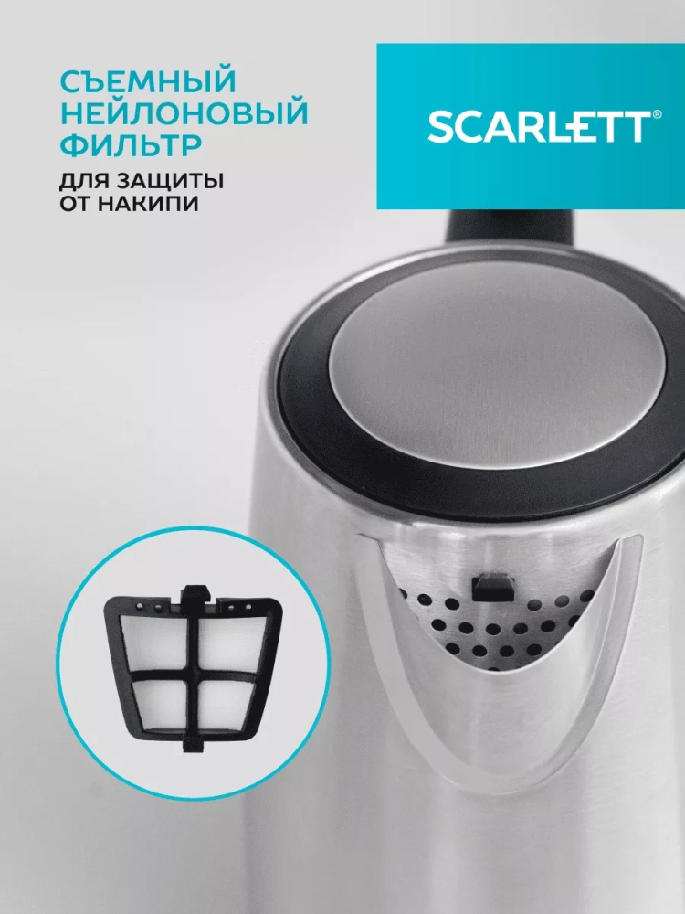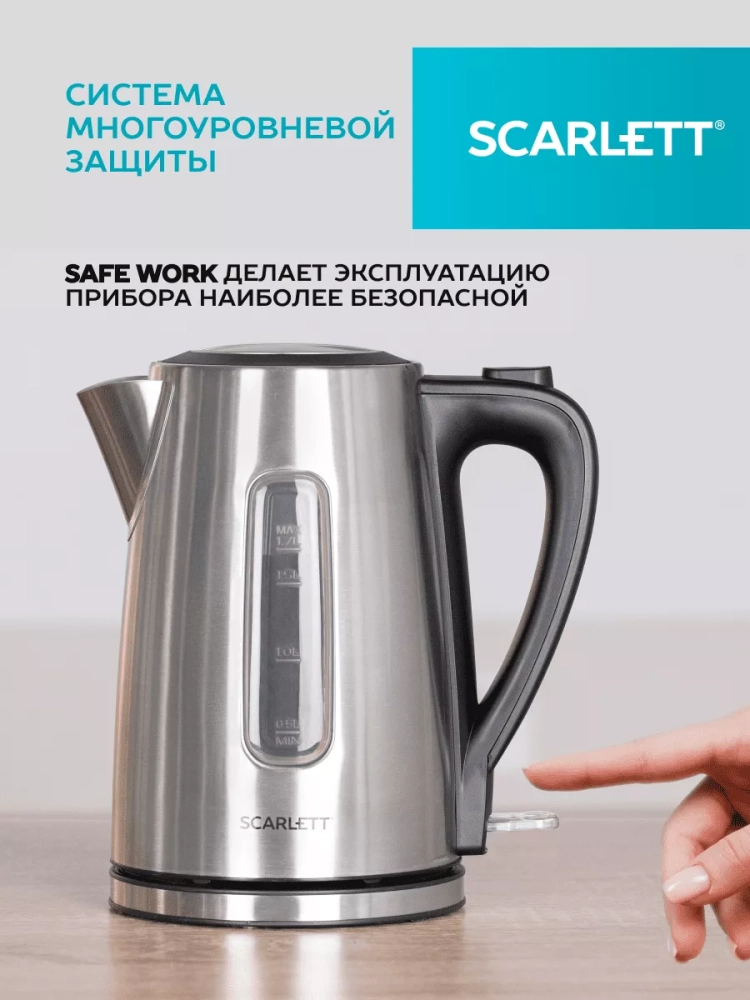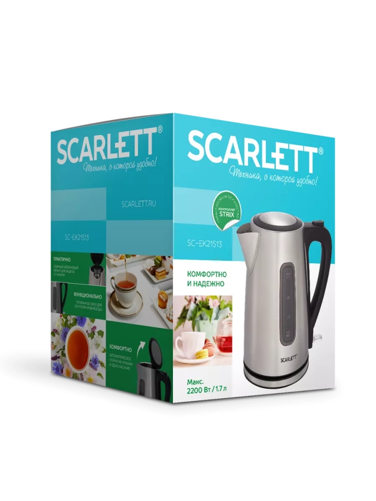 Scarlett SC-EK21S13 – электрический чайник мощностью 2200 Вт и объемом 1.7 л оснащён автоматической системой открывания крышки. Эргономичная ручка и закрытый нагревательный элемент сделают эксплуатацию прибора еще проще и комфортнее. Чайник оснащен контроллером STRIX, что делает его работу еще проще и надежней. Система защиты SAFE WORK с автоотключением при закипании и защитой от включения без воды сделает эксплуатацию прибора безопасной.
