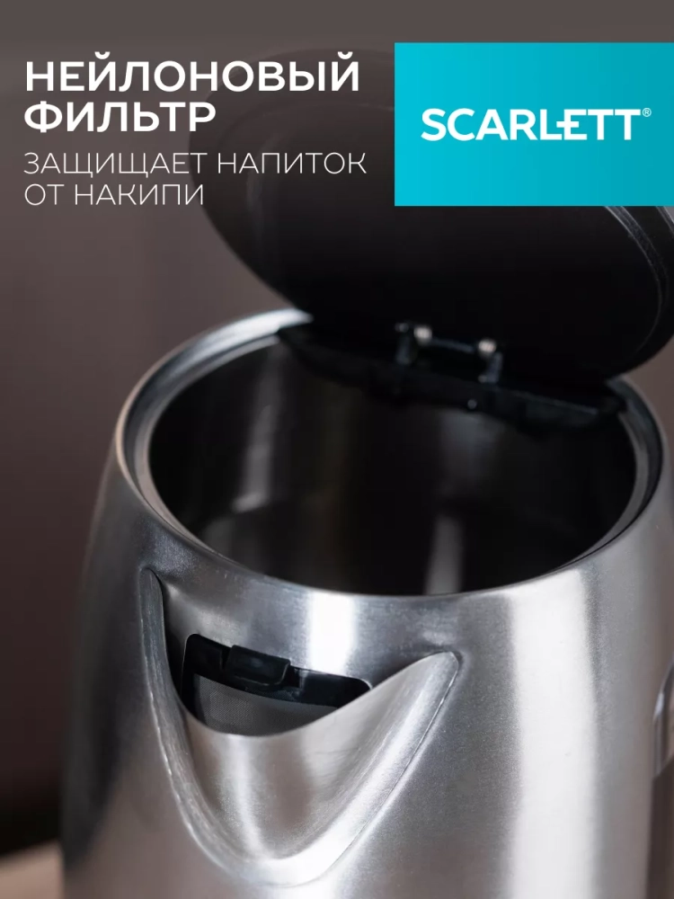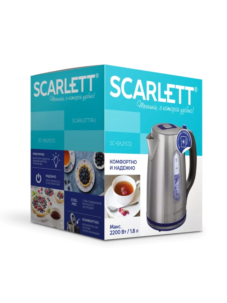 Электрический чайник SC-EK21S72 с увеличенным объемом 1.8 л оснащён автоматической системой открытия крышки. Элегантная, эргономичная ручка, нейлоновый фильтр, закрытый нагревательный элемент, сделают эксплуатацию прибора еще проще и комфортнее. Внутренняя подсветка позволит наблюдать за завораживающим процессом кипячения воды. Safe Work – автоотключение при закипании, защита от включения без воды сделают эксплуатацию прибора наиболее безопасной. Классическое сочетание цветов станет удачным решением на кухне!