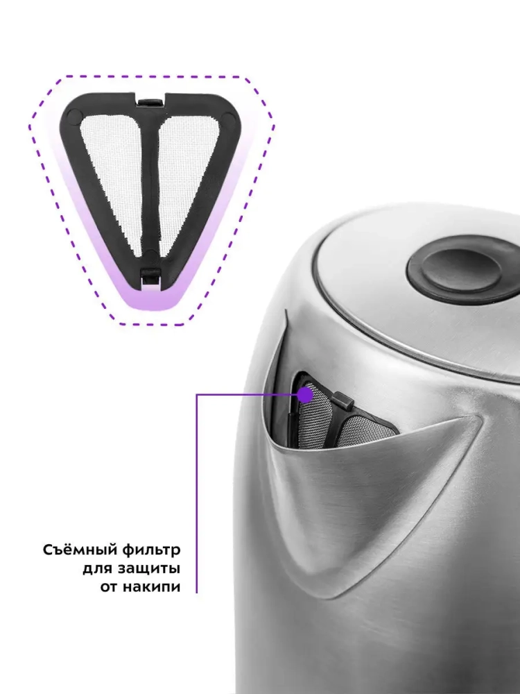 Нагревательный элемент (ТЭН) у этой модели чайника скрытый и находится в донной части. Сверху он закрыт специальной металлической пластиной из нержавеющей стали, благодаря которой исключается прямой контакт ТЭНа с водой. Такая конструкция препятствует образованию накипи, облегчает уход и значительно снижает шум при нагревании воды.