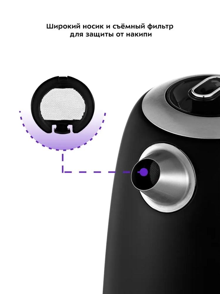 Нагревательный элемент (ТЭН) у этой модели чайника скрытый и находится в донной части. Сверху он закрыт специальной металлической пластиной из нержавеющей стали, благодаря которой исключается прямой контакт ТЭНа с водой. Такая конструкция препятствует образованию накипи, облегчает уход и значительно снижает шум при нагревании воды.