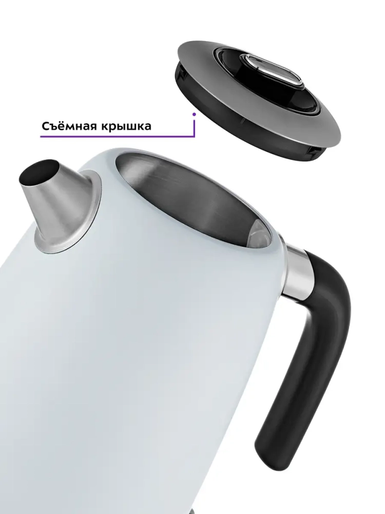 Корпус чайника и крышка выполнены из нержавеющей стали, а подставка из пластика.