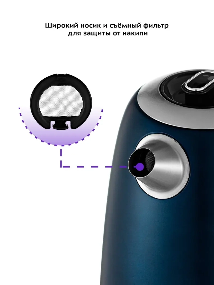 Нагревательный элемент (ТЭН) у этой модели чайника скрытый и находится в донной части. Сверху он закрыт специальной металлической пластиной из нержавеющей стали, благодаря которой исключается прямой контакт ТЭНа с водой. Такая конструкция препятствует образованию накипи, облегчает уход и значительно снижает шум при нагревании воды.