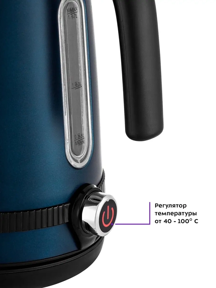 Ручка чайника пластиковая. Она не нагревается и удобно лежит в руке. Под ручкой расположен регулятор температуры, с помощью которого можно выбрать необходимую температуру нагрева от 40 до 100 °С. На LED-дисплее, который расположен сбоку корпуса, постоянно отображается температура воды, что очень удобно.