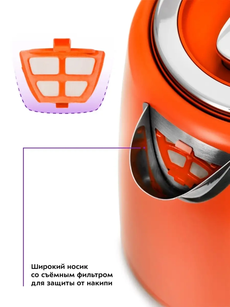 Чайник автоматически отключается при закипании, имеет защиту от перегрева и от включения без воды. В носике чайника расположен съемный фильтр от накипи. Фильтр фиксируется и плотно прилегает к внутренним стенкам чайника, так что накипь не сможет проскользнуть мимо мелкой сетки фильтра.