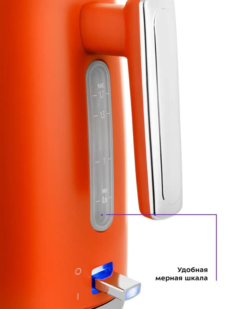 Корпус чайника металлический. Крышка и подставка выполнены из приятного на ощупь пластика. Мерная шкала находится под ручкой. Ручка чайника пластиковая, не нагревается и удобно лежит в руке. Внутренняя поверхность чайника выполнена из нержавеющей стали, благодаря чему вода не соприкасается с пластиком.