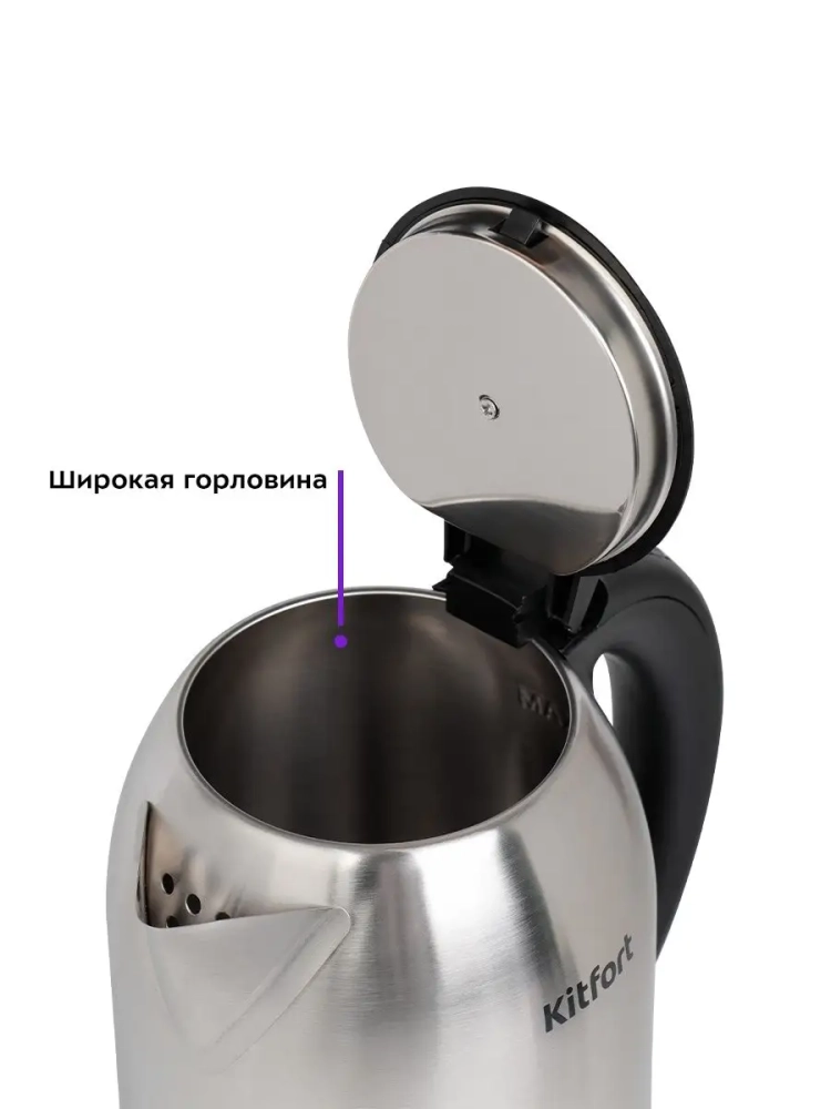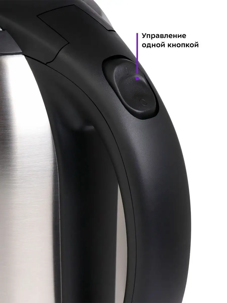 Электрический чайник Kitfort КТ-6162 предназначен для кипячения воды дома, в офисе, на даче. Корпус чайника выполнен из нержавеющей стали. Подставка выполнена из пластика, а крышка - из пластмассы с вставкой из нержавеющей стали. Мерная шкала находится внутри корпуса. Ручка чайника пластиковая, не нагревается и удобно лежит в руке. Внутренняя поверхность чайника состоит из металла, благодаря чему вода не соприкасается с пластиком. Кнопка "Вкл/Выкл" находится на ручке. При включении чайника загорается подсветка индикатора работы. Полный чайник закипает за 8 минут. Нагревательный элемент (ТЭН) у этой модели чайника скрытый и находится в донной части. Сверху он закрыт специальной металлической пластиной из нержавеющей стали, благодаря которой исключается прямой контакт ТЭНа с водой. Такая конструкция препятствует образованию накипи, облегчает уход и значительно снижает шум при нагревании воды. Подставка с центральным контактом дает возможность располагать на ней чайник в любом положении, обеспечивая вращение на 360°. Снизу имеется отсек для хранения шнура, в который можно смотать излишки шнура электропитания, чтобы он не мешал на столе. Чайник автоматически отключается при закипании, имеет защиту от перегрева и от включения без воды. При закипании воды образующийся пар попадает в паропровод, проходит по нему и затем воздействует на термодатчик, который отключает чайник. Во время кипячения рекомендуется держать крышку плотно закрытой, иначе данный механизм может отработать неправильно.