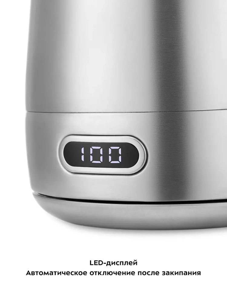 Корпус чайника, крышка и подставка выполнены из сочетания пластмассы и нержавеющей стали. Мерная шкала нанесена на прозрачную часть корпуса под ручкой. Съемная крышка и большое горлышко чайника облегчают доступ внутрь при его мойке и во время удаления накипи. Ручка чайника пластиковая, не нагревается и удобно лежит в руке. Дисплей расположен на корпусе чайника. На дисплее отображается настраиваемая или текущая температура воды в чайнике, что очень удобно.