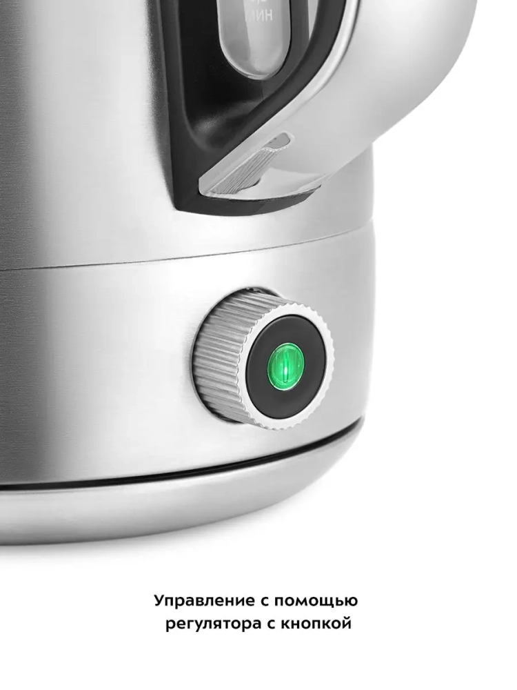 Подставка с центральным контактом дает возможность располагать на ней чайник в любом положении, обеспечивая вращение на 360 °. Снизу имеется отсек для хранения шнура, в который можно смотать излишки шнура электропитания, чтобы он не мешал на столе. Под ручкой расположен регулятор с кнопкой «Вкл/Выкл», которые включают и выключают чайник, увеличивают и уменьшают температуру, а также включают и отключают режим поддержания температуры. Регулятор оборудован световой индикацией, позволяющей легко определить, какая программа активна. После закипания, изменения и окончания программ, а также при установке и снятии чайника с подставки раздается звуковой сигнал.