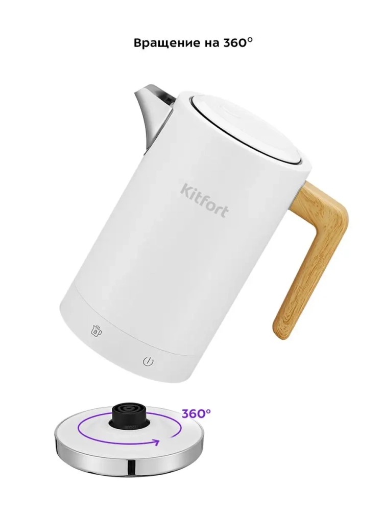 Подставка с центральным контактом дает возможность располагать на ней чайник в любом положении, обеспечивая вращение на 360 °. Снизу имеется отсек, в который можно смотать излишки шнура электропитания, чтобы он не мешал на столе.