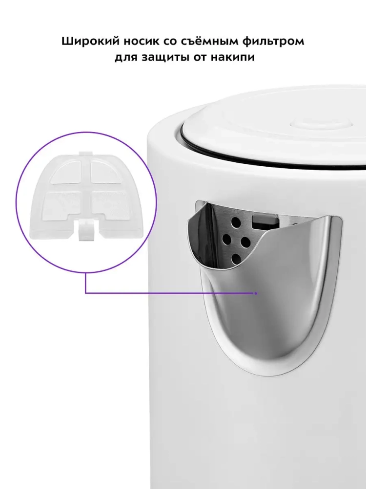 Нагревательный элемент (ТЭН) у этой модели чайника скрытый и находится в донной части. Сверху он закрыт специальной металлической пластиной из нержавеющей стали, благодаря которой исключается прямой контакт ТЭНа с водой. Такая конструкция препятствует образованию накипи, облегчает уход и значительно снижает шум при нагревании воды.
