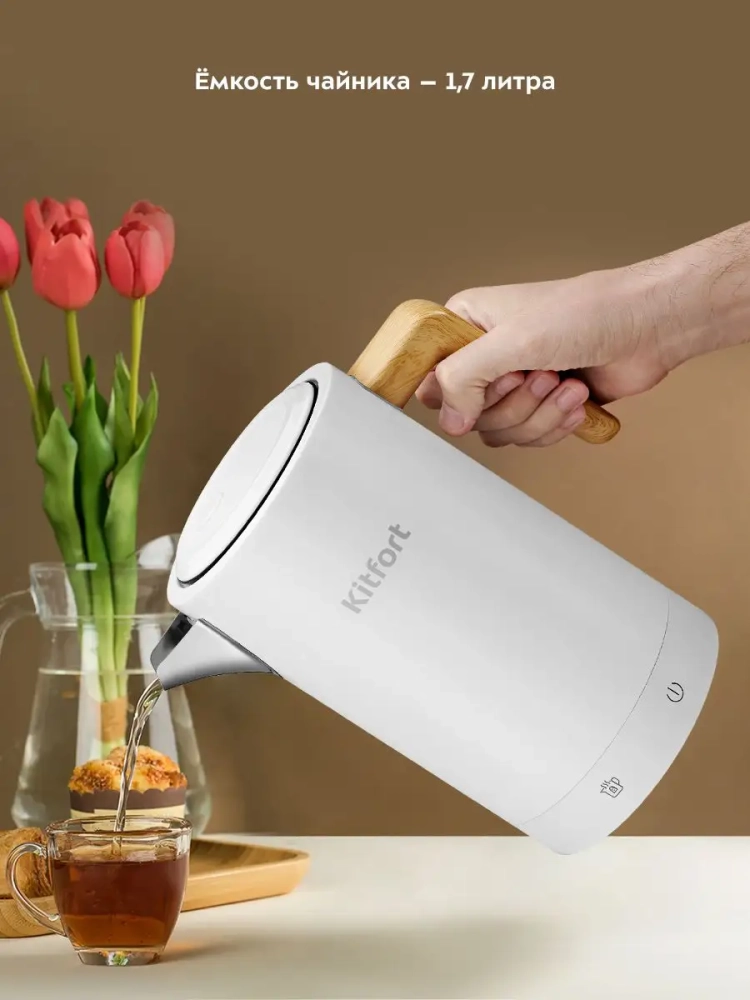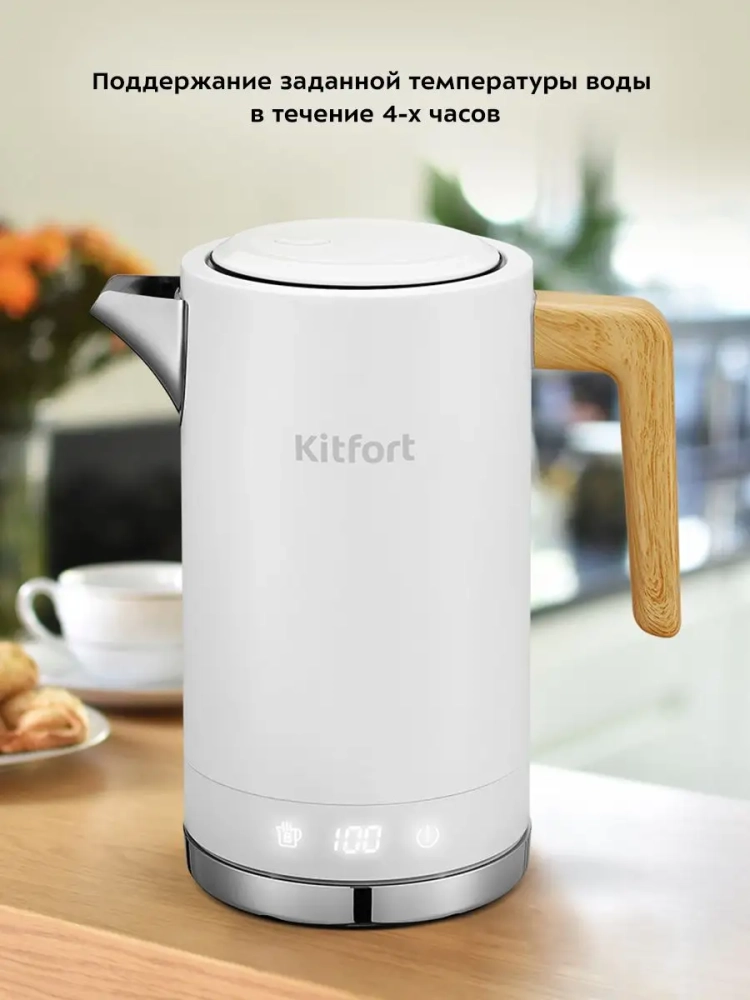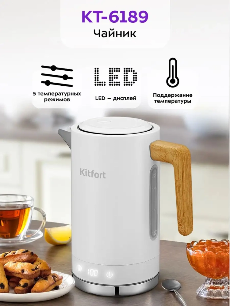 Электрический чайник с электронным терморегулятором Kitfort КТ-6189 может не только вскипятить воду, но и нагреть ее до температур: 40, 60, 80, 90 и 100 °С, что очень удобно при заваривании различных сортов чая. Температура 40 °С удобна для приготовления детского питания. Чайник также оснащен функцией поддержания температуры. Температура воды контролируется встроенным в дно чайника термодатчиком.