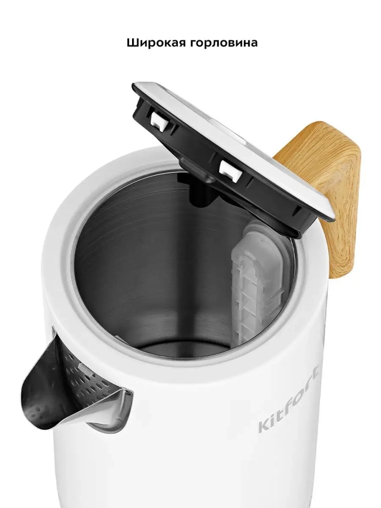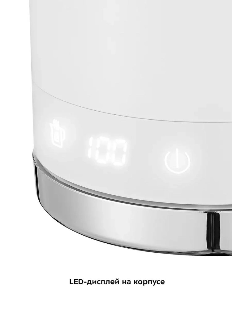 Корпус чайника выполнен из пластмассы и нержавеющей стали, а крышка и подставка — из пластмассы. Мерная шкала нанесена на прозрачную часть корпуса под ручкой. Большое горлышко чайника облегчает доступ внутрь при его мойке и во время удаления накипи. Ручка чайника пластиковая, не нагревается и удобно лежит в руке. На нижней части корпуса расположена панель управления чайником и LED-дисплей. На дисплее отображается температура воды в чайнике. Температура воды на дисплее отображается постоянно, что очень удобно. Все кнопки со световой индикацией, позволяющей легко определить, какая программа активна. После закипания, изменения и окончания программ, а также при установке и снятии чайника с подставки раздается звуковой сигнал