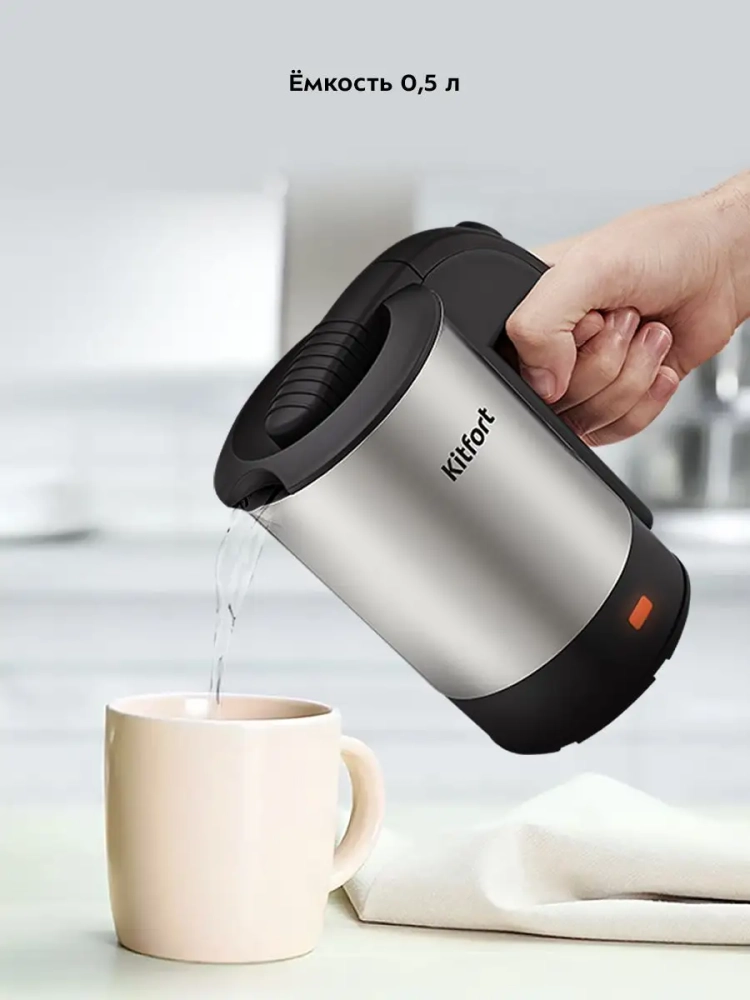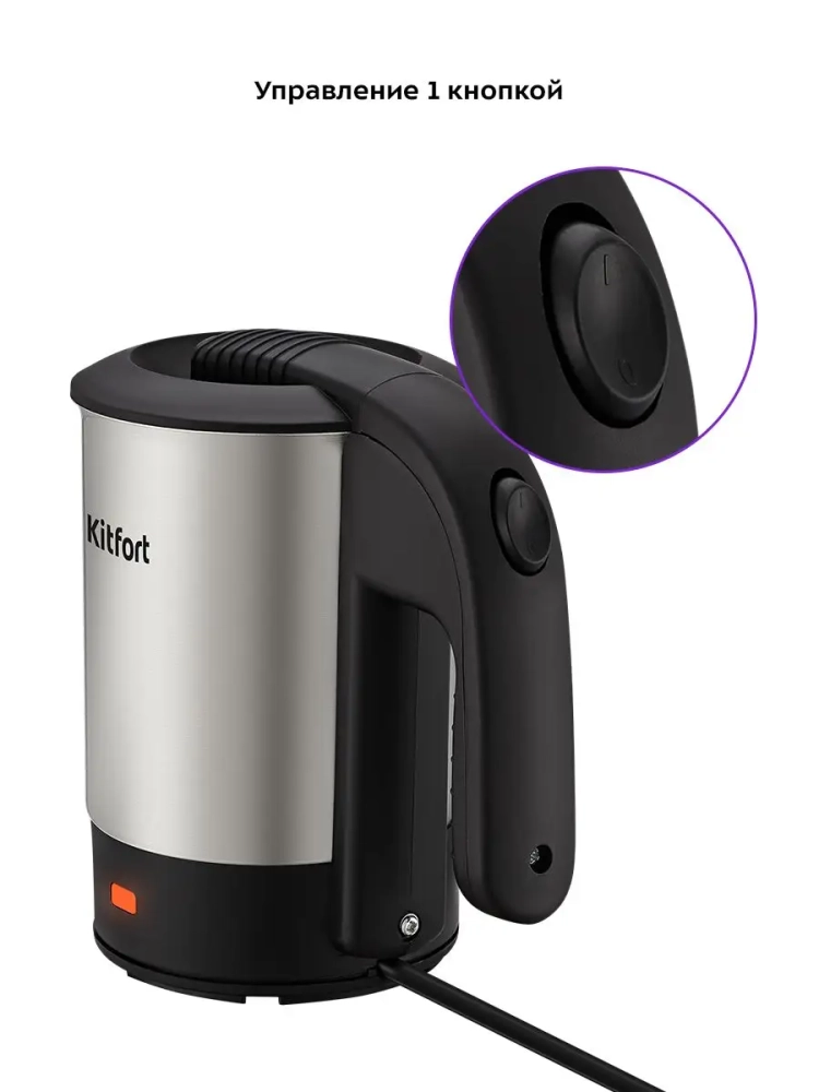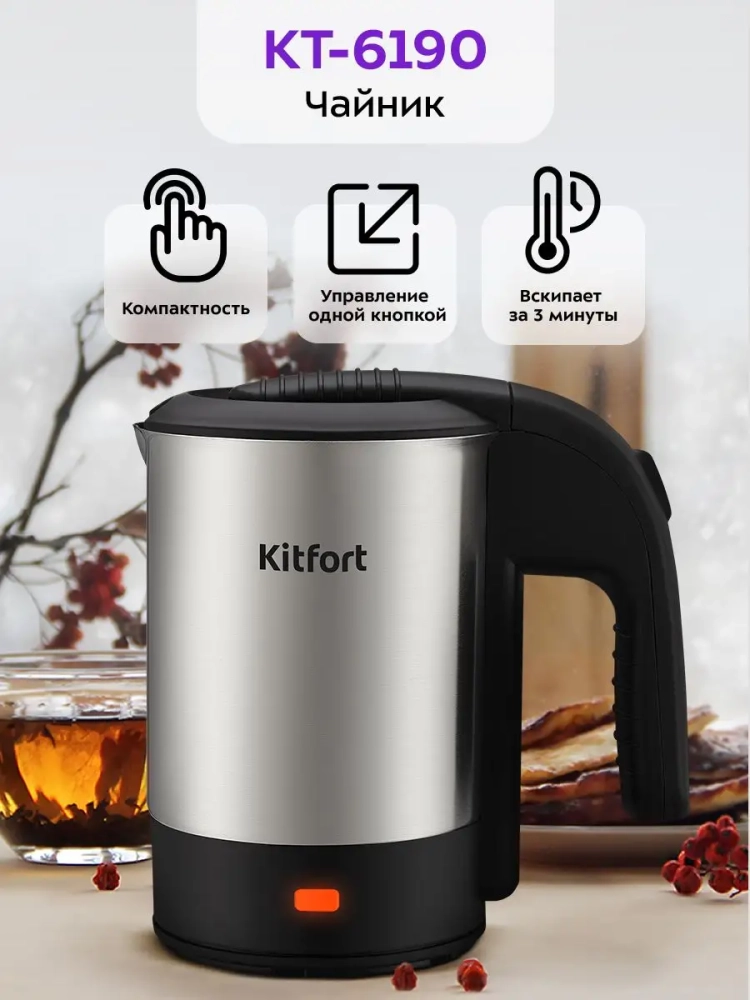 Электрический чайник Kitfort КТ-6190 предназначен для кипячения воды дома, в офисе, на даче. Мощность прибора позволяет использовать его в домах со слабой проводкой. Чайник компактный, поэтому не займет много места, если брать его с собой. Кроме того, прибор позволит быстро вскипятить небольшое количество воды. Полный чайник закипает примерно за 3 минуты.