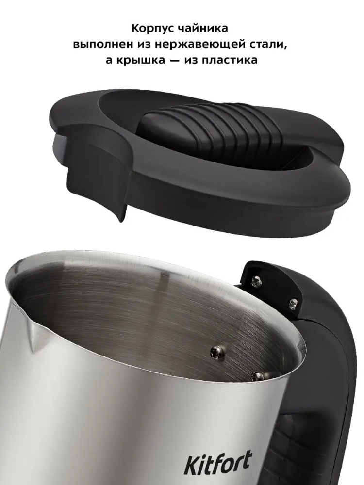 Корпус чайника выполнен из нержавеющей стали, а крышка — из пластика. Ручка чайника пластиковая, не нагревается и удобно лежит в руке. Съемная крышка облегчает доступ во время мытья чайника.