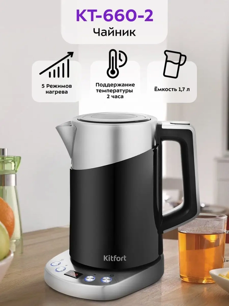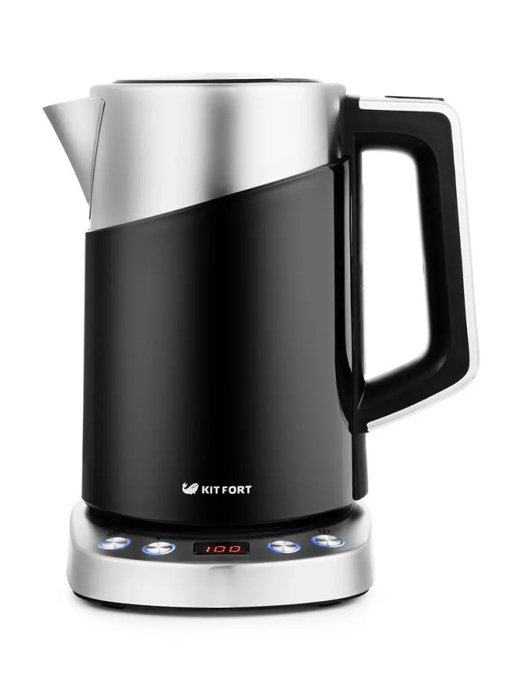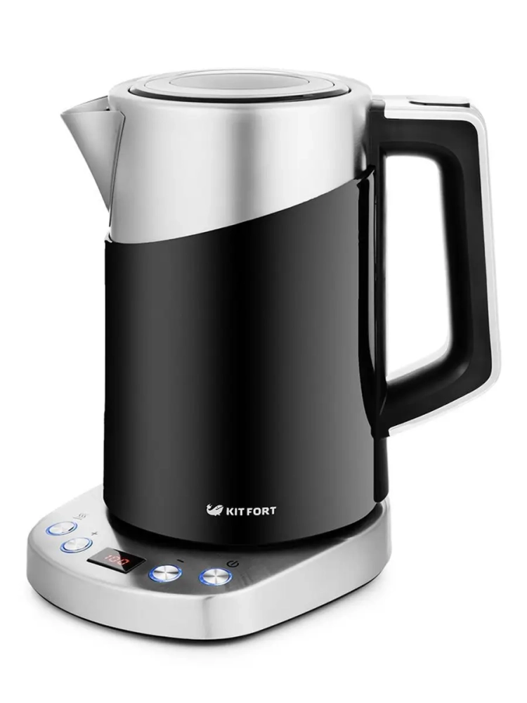 Электрический чайник с электронным терморегулятором Kitfort КТ-660 может не только вскипятить воду, но и нагреть ее до температуры 60, 70, 80 и 90 °С, что очень удобно при заваривании различных сортов чая. Чайник также оснащен функцией поддержания температуры. Температура воды контролируется встроенным в дно чайника термодатчиком.
