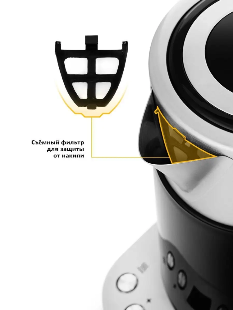 Чайник Китфорт КТ-660 автоматически отключается при закипании, имеет защиту от перегрева и от включения без воды. В носике чайника расположен съемный фильтр от накипи.